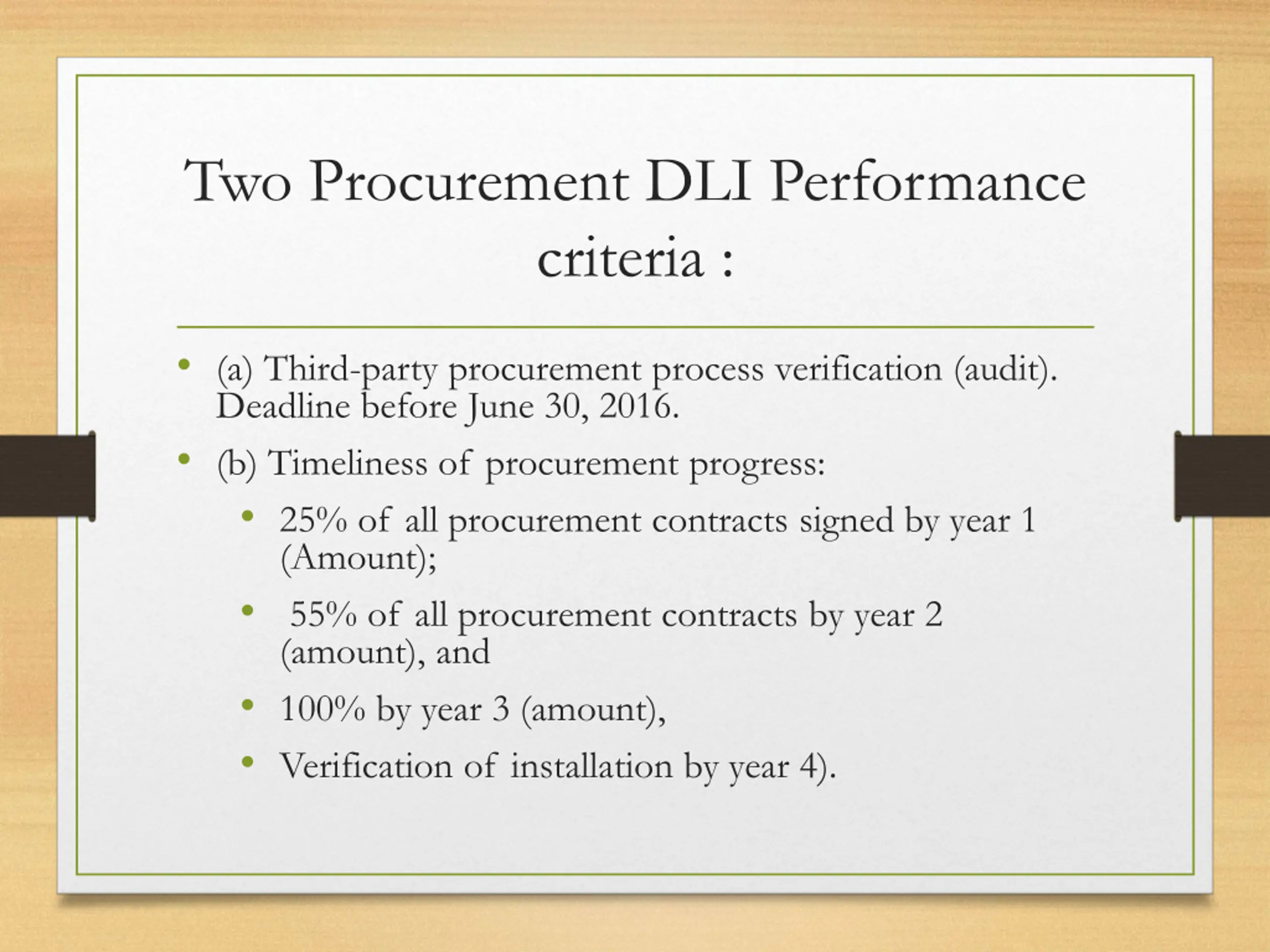 Two Procurement DLI Performance criteria : (a) Third-party procurement process verification (audit). Deadline before June 30, 2016. (b) Timeliness of procurement progress: 25% of all procurement contracts signed by year 1 (Amount); 55% of all procurement contracts by year 2 (amount), and 100% by year 3 (amount), Verification of installation by year 4).