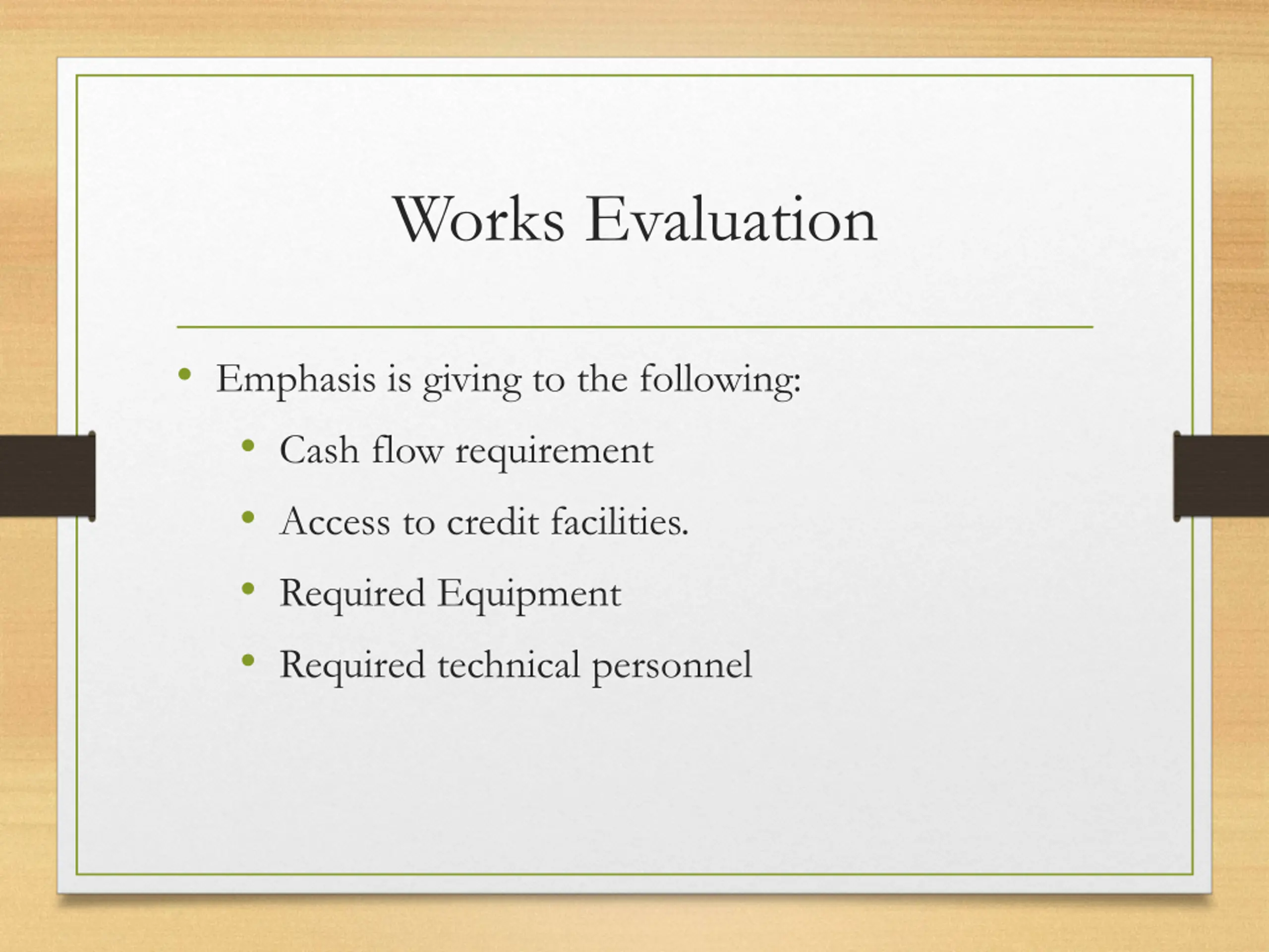 Works Evaluation Emphasis is giving to the following: Cash flow requirement Access to credit facilities. Required Equipment Required technical personnel