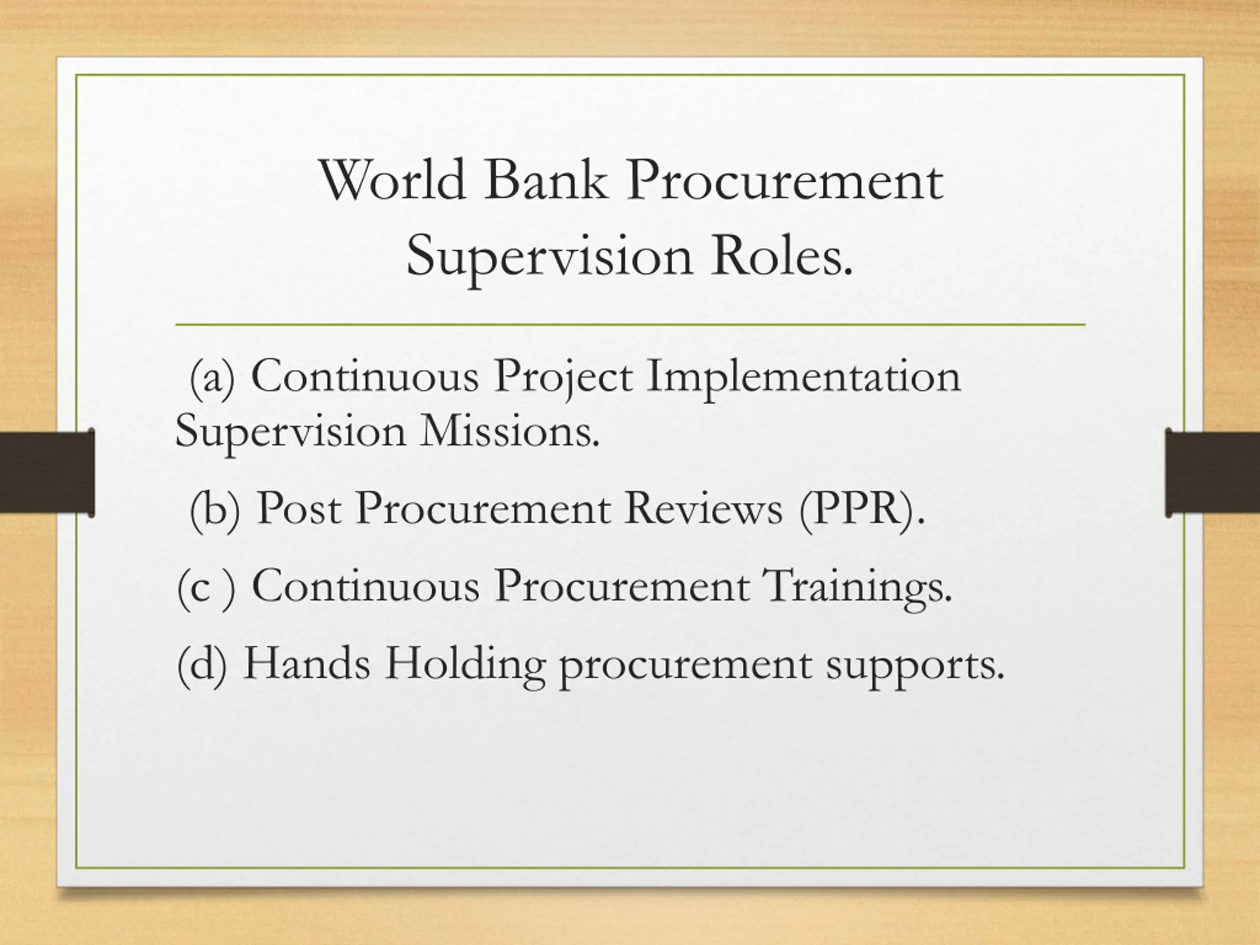 World Bank Procurement Supervision Roles. (a) Continuous Project Implementation Supervision Missions. (b) Post Procurement Reviews (PPR). (c ) Continuous Procurement Trainings. (d) Hands Holding procurement supports.