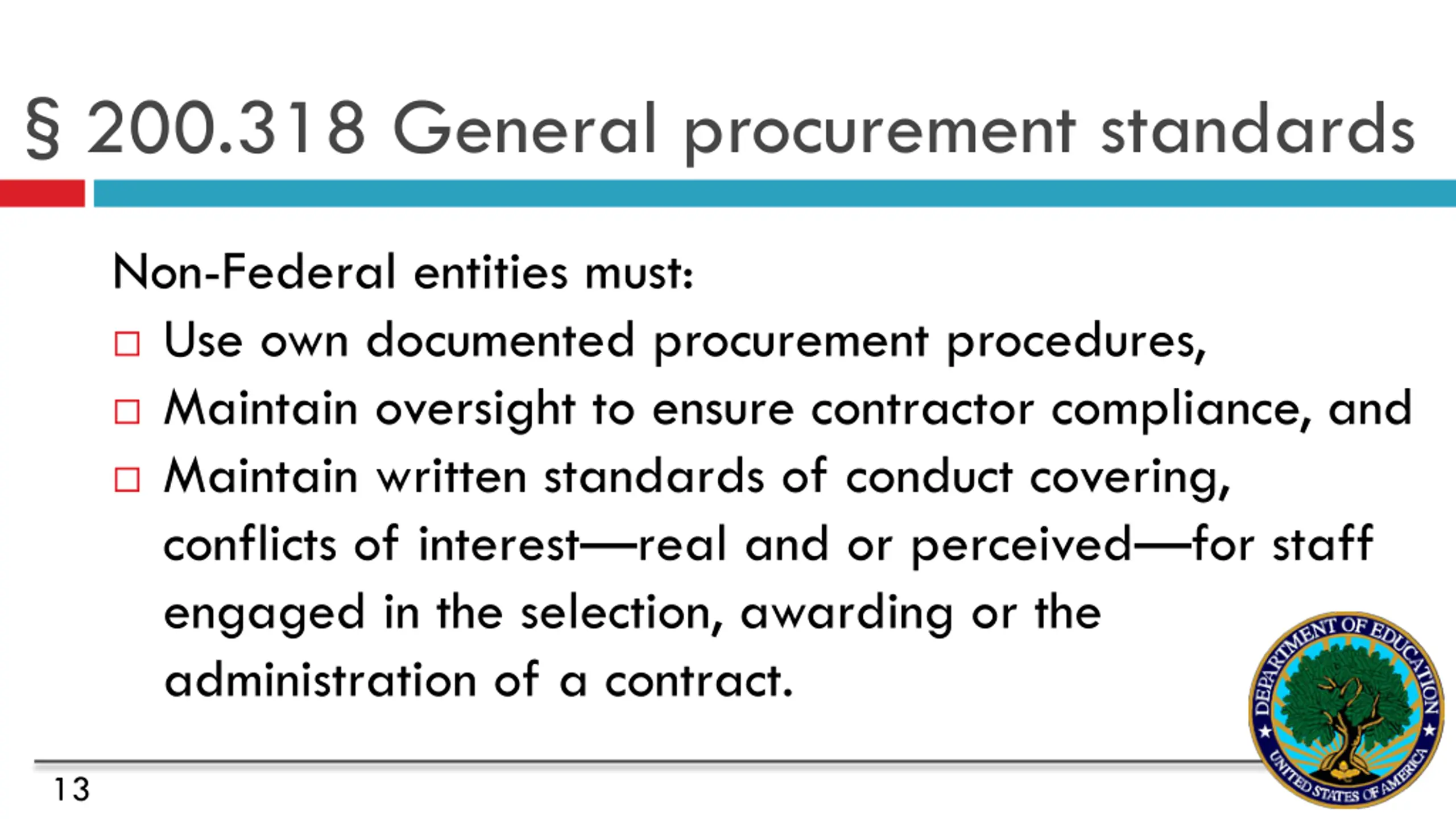 200.318 General procurement standards Non-Federal entities must: Use own documented procurement procedures, Maintain oversight to ensure contractor compliance, and Maintain written standards of conduct covering, conflicts of interest real and or perceived for staff engaged in the selection, awarding or the administration of a contract. 13
