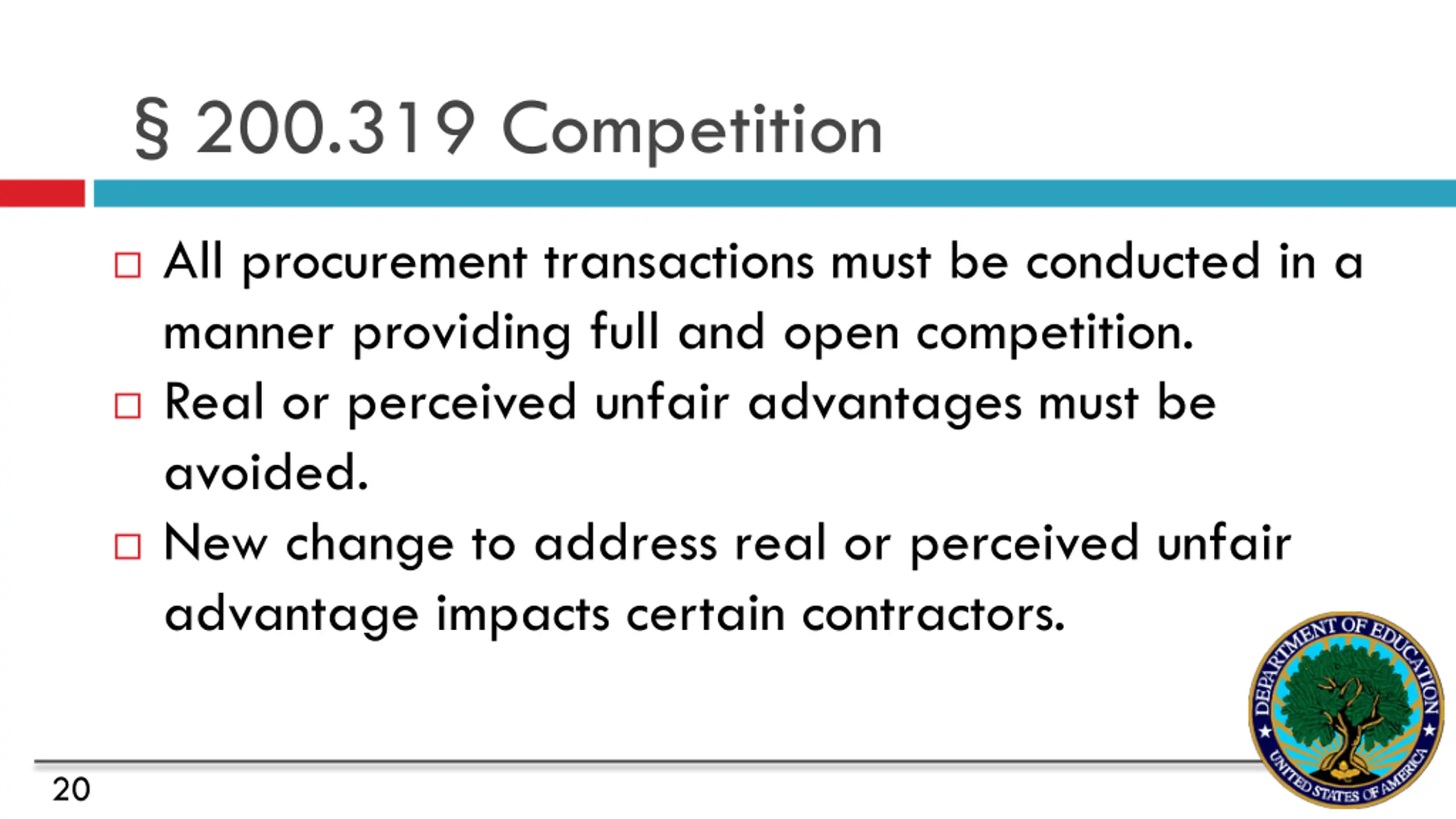200.319 Competition All procurement transactions must be conducted in a manner providing full and open competition. Real or perceived unfair advantages must be avoided. New change to address real or perceived unfair advantage impacts certain contractors. 20