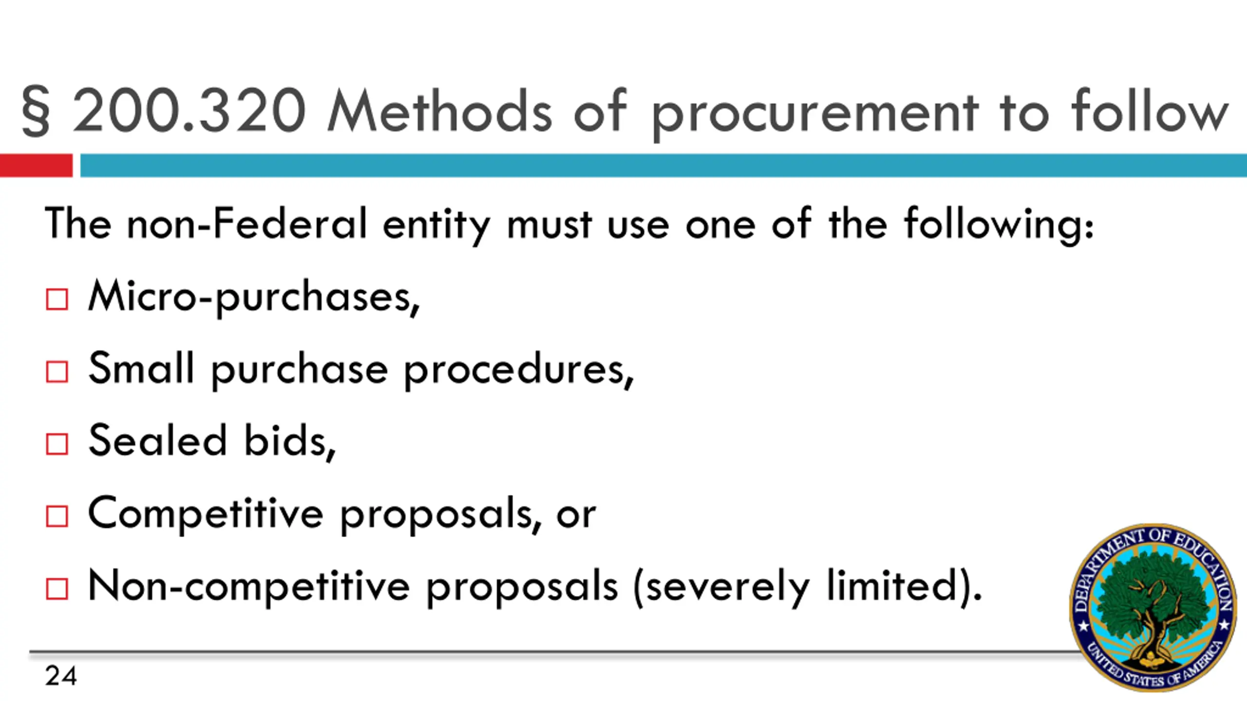 200.320 Methods of procurement to follow The non-Federal entity must use one of the following: Micro-purchases, Small purchase procedures, Sealed bids, Competitive proposals, or Non-competitive proposals (severely limited). 24