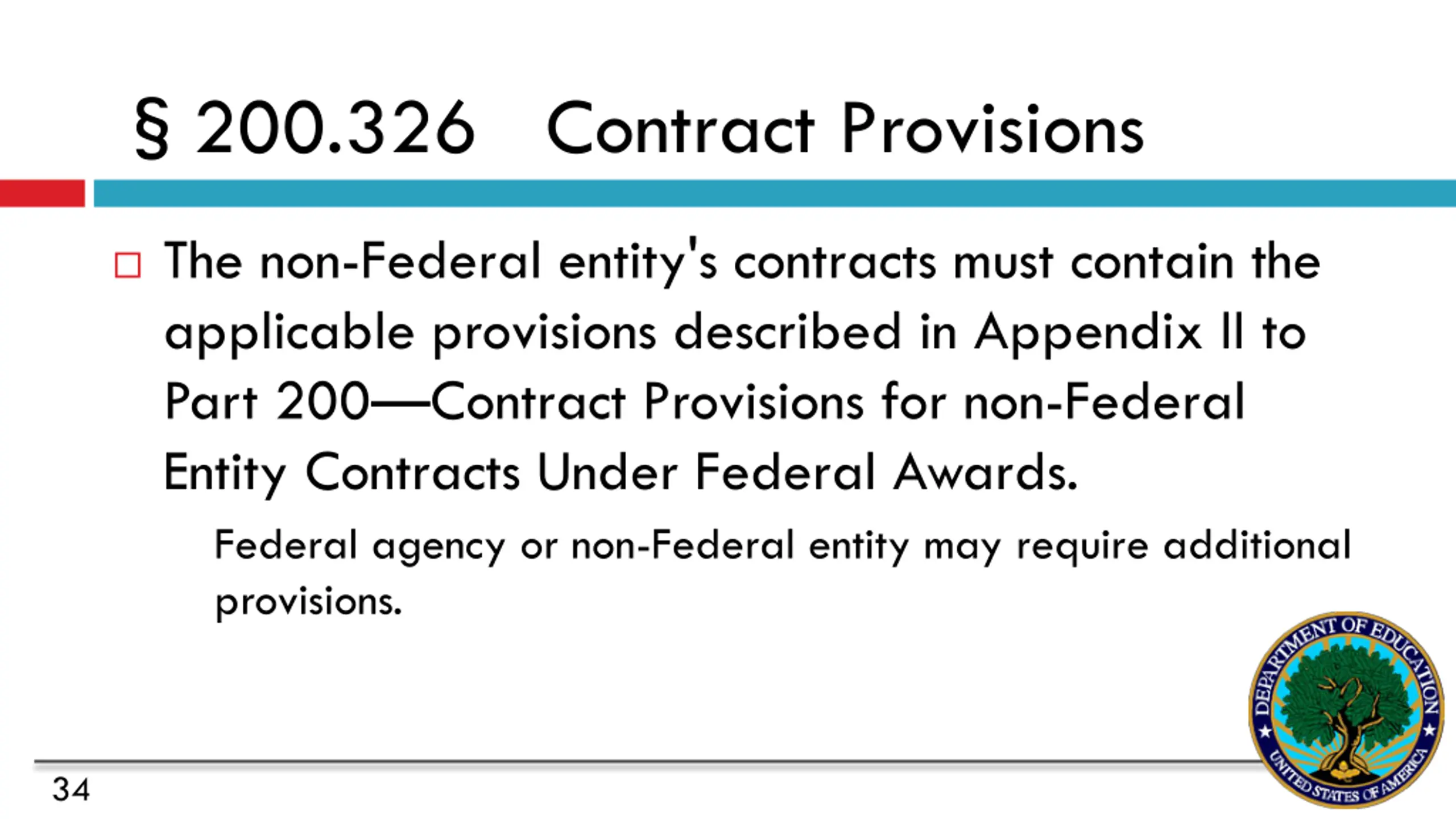 200.326 Contract Provisions The non-Federal entity's contracts must contain the applicable provisions described in Appendix II to Part 200 Contract Provisions for non-Federal Entity Contracts Under Federal Awards. Federal agency or non-Federal entity may require additional provisions. 34