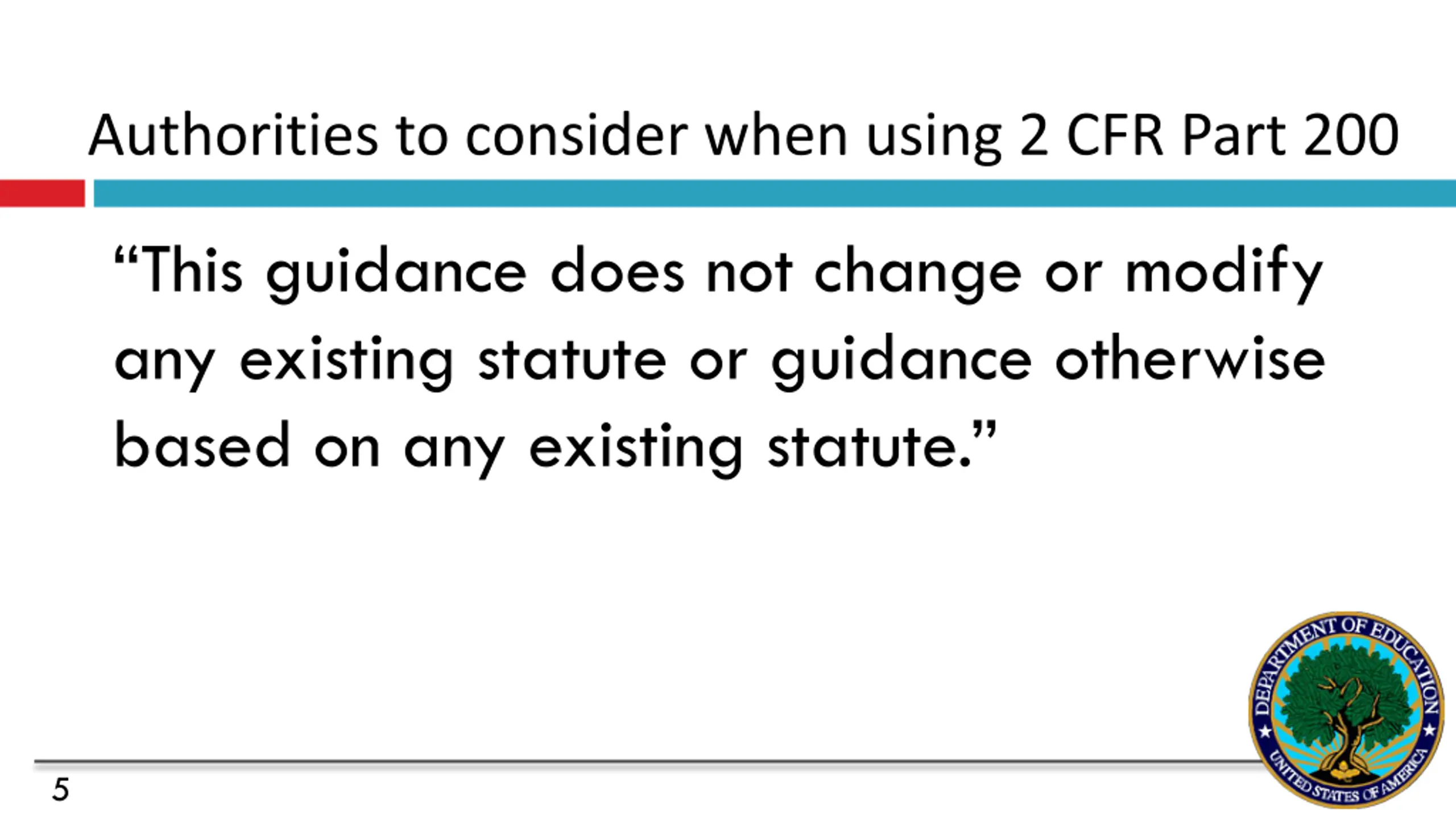 Authorities to consider when using 2 CFR Part 200 This guidance does not change or modify any existing statute or guidance otherwise based on any existing statute. 5