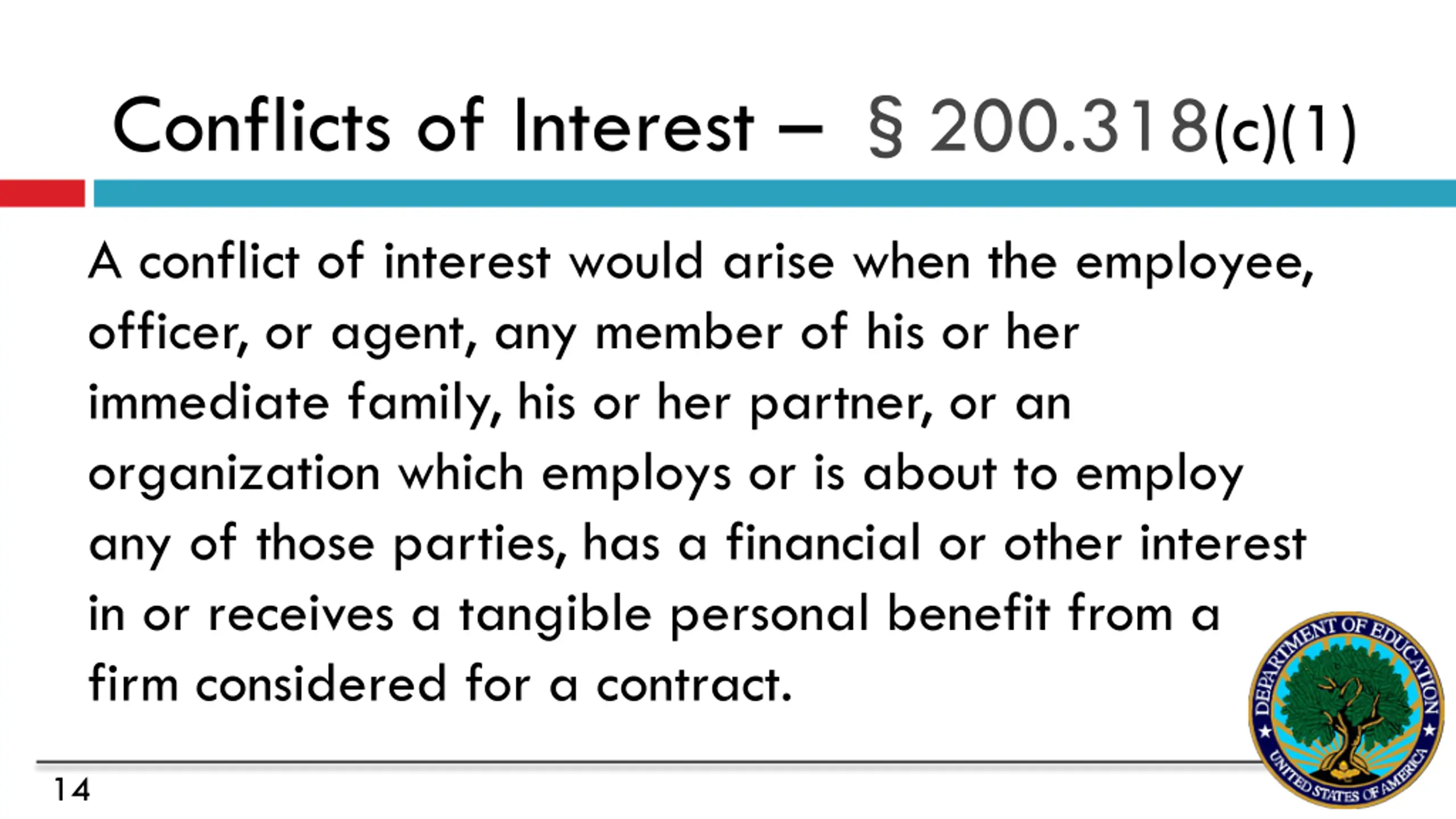 Conflicts of Interest 200.318(c)(1) A conflict of interest would arise when the employee, officer, or agent, any member of his or her immediate family, his or her partner, or an organization which employs or is about to employ any of those parties, has a financial or other interest in or receives a tangible personal benefit from a firm considered for a contract. 14 14