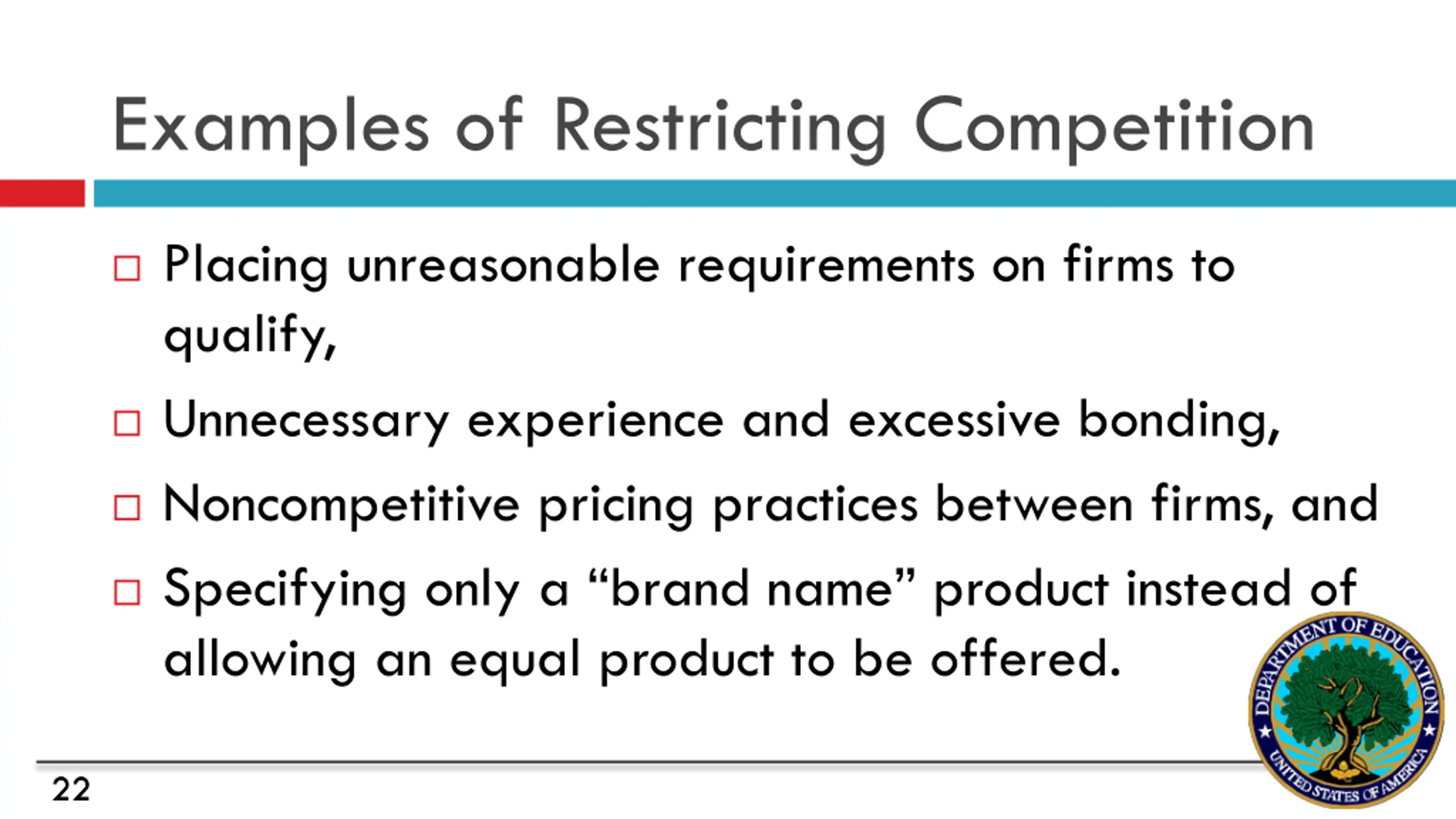 Examples of Restricting Competition Placing unreasonable requirements on firms to qualify, Unnecessary experience and excessive bonding, Noncompetitive pricing practices between firms, and Specifying only a brand name product instead of allowing an equal product to be offered. 22 22
