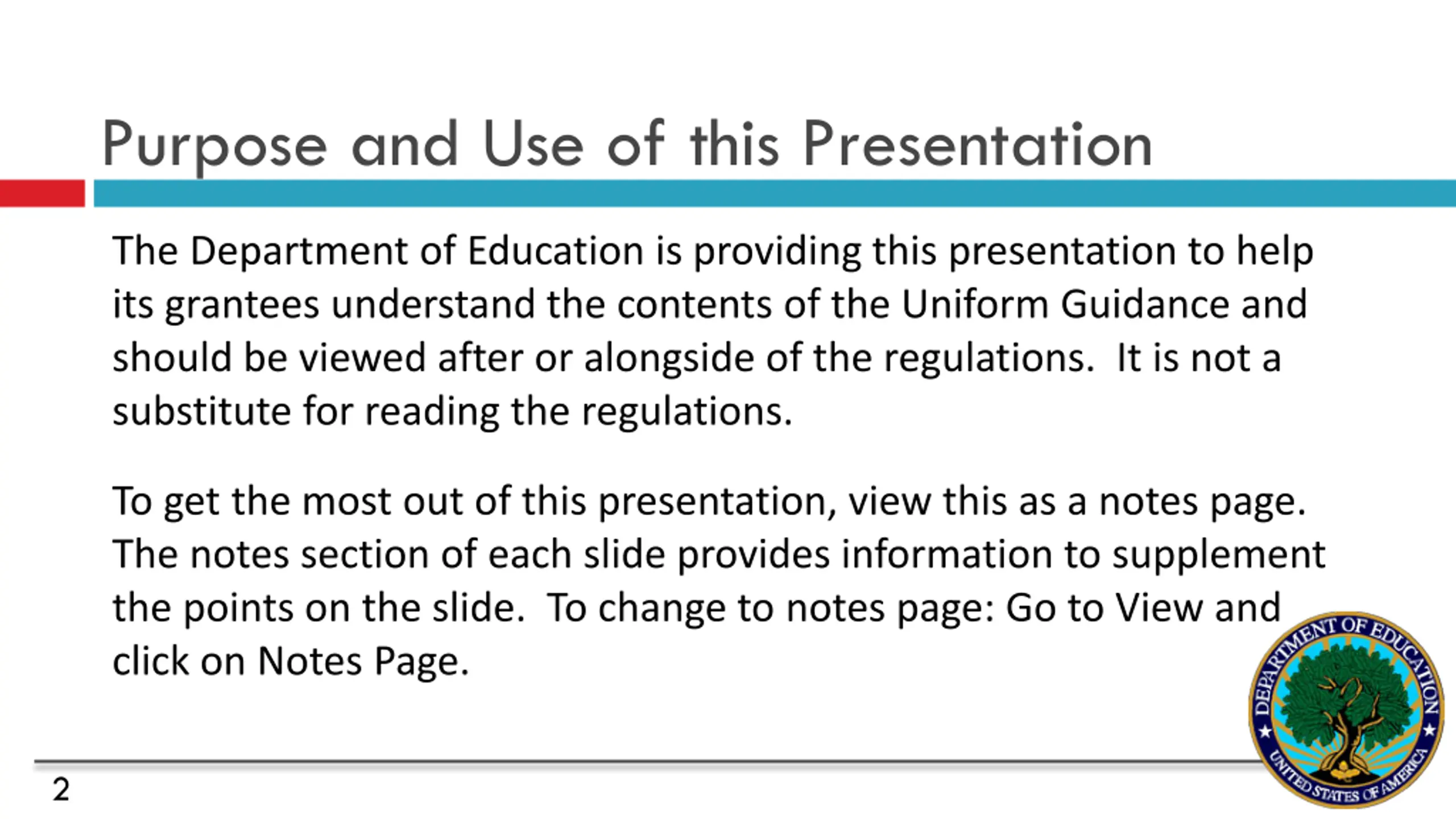 Purpose and Use of this Presentation The Department of Education is providing this presentation to help its grantees understand the contents of the Uniform Guidance and should be viewed after or alongside of the regulations. It is not a substitute for reading the regulations. To get the most out of this presentation, view this as a notes page. The notes section of each slide provides information to supplement the points on the slide. To change to notes page: Go to View and click on Notes Page. 2