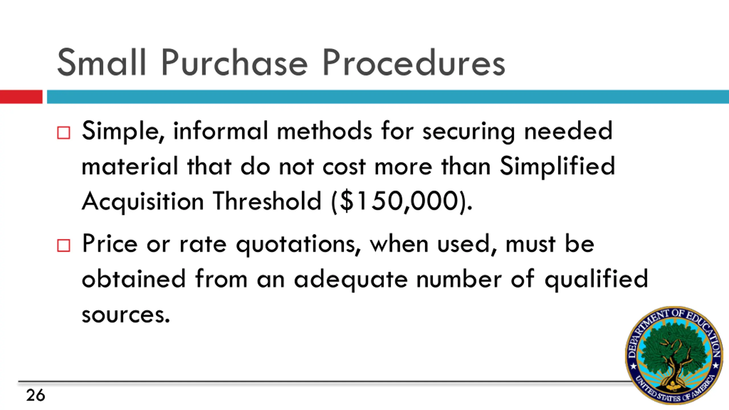 Small Purchase Procedures Simple, informal methods for securing needed material that do not cost more than Simplified Acquisition Threshold ($150,000). Price or rate quotations, when used, must be obtained from an adequate number of qualified sources. 26 26