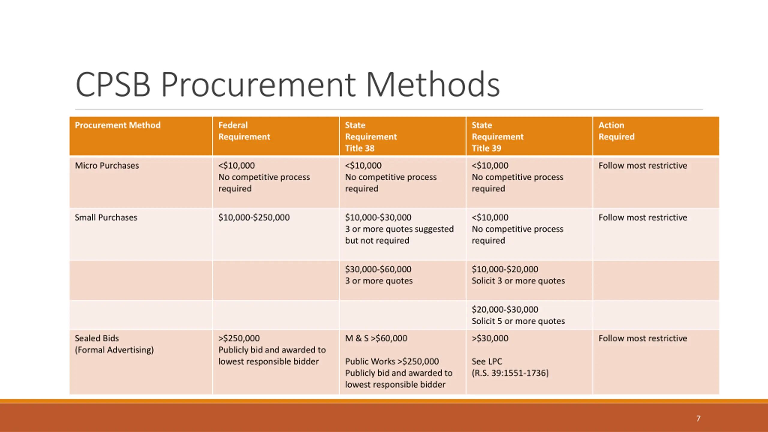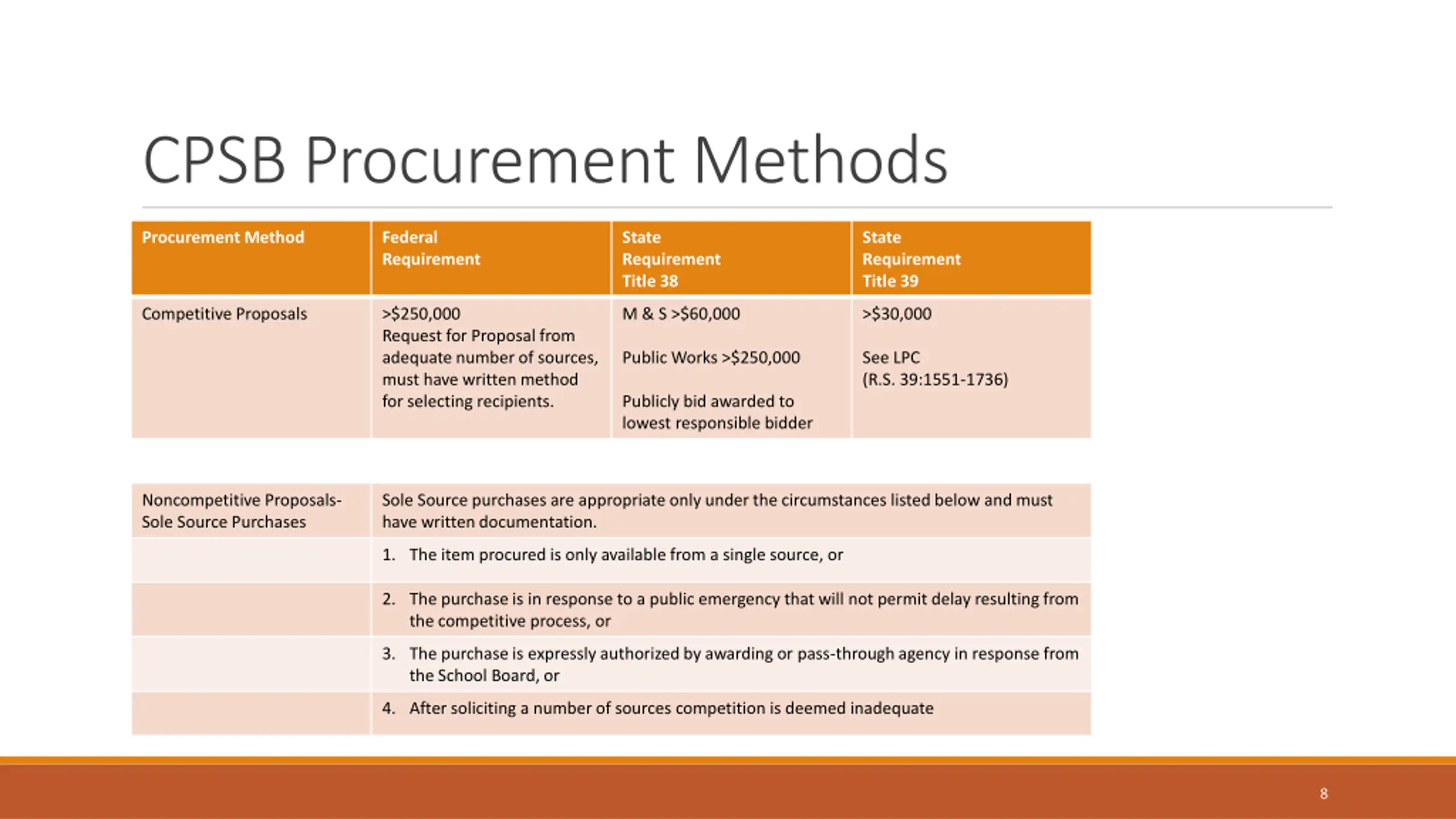 CPSB Procurement Methods Procurement Method Federal Requirement State Requirement Title 38 State Requirement Title 39 Action Required Micro Purchases <$10,000 No competitive process required <$10,000 No competitive process required <$10,000 No competitive process required Follow most restrictive Small Purchases $10,000-$250,000 $10,000-$30,000 3 or more quotes suggested but not required <$10,000 No competitive process required Follow most restrictive $30,000-$60,000 3 or more quotes $10,000-$20,000 Solicit 3 or more quotes $20,000-$30,000 Solicit 5 or more quotes Sealed Bids (Formal Advertising) >$250,000 Publicly bid and awarded to lowest responsible bidder M & S >$60,000 >$30,000 Follow most restrictive Public Works >$250,000 Publicly bid and awarded to lowest responsible bidder See LPC (R.S. 39:1551-1736) 7