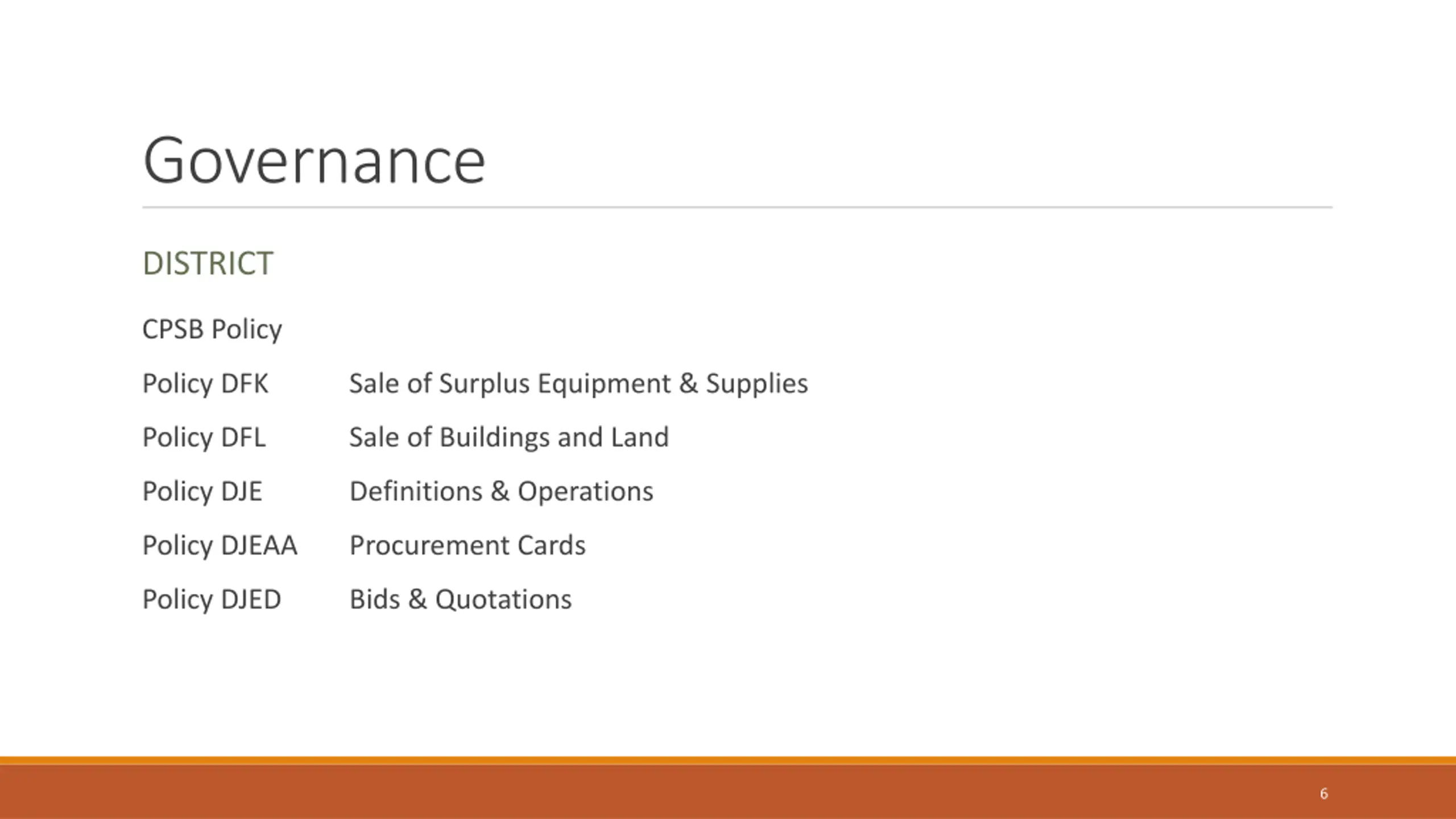 Governance DISTRICT CPSB Policy Policy DFK Sale of Surplus Equipment & Supplies Policy DFL Sale of Buildings and Land Policy DJE Definitions & Operations Policy DJEAA Procurement Cards Policy DJED Bids & Quotations 6