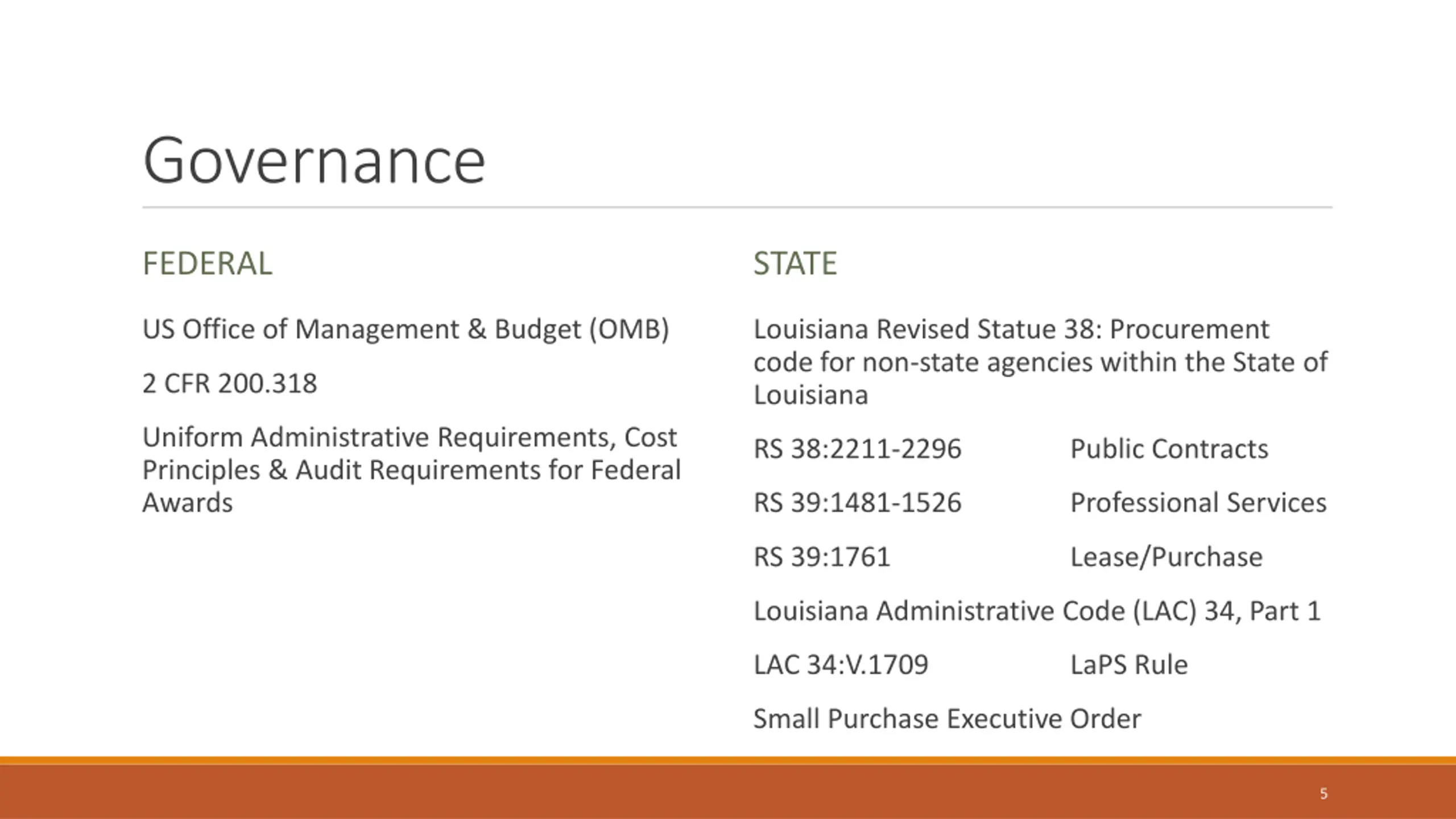 Governance FEDERAL STATE US Office of Management & Budget (OMB) Louisiana Revised Statue 38: Procurement code for non-state agencies within the State of Louisiana 2 CFR 200.318 Uniform Administrative Requirements, Cost Principles & Audit Requirements for Federal Awards RS 38:2211-2296 Public Contracts RS 39:1481-1526 Professional Services RS 39:1761 Lease/Purchase Louisiana Administrative Code (LAC) 34, Part 1 LAC 34:V.1709 LaPS Rule Small Purchase Executive Order 5