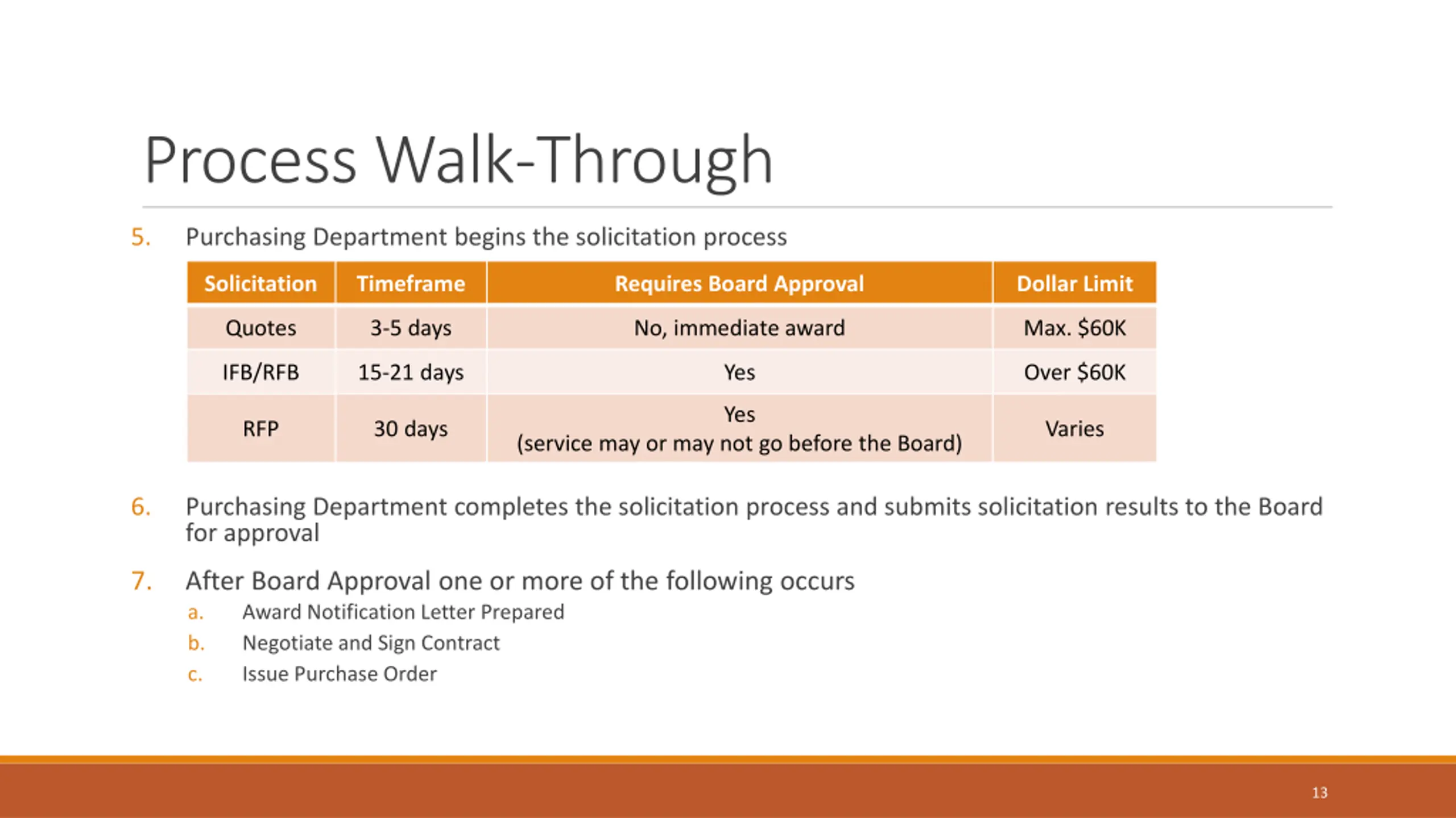 Process Walk-Through 5. Purchasing Department begins the solicitation process Solicitation Timeframe Requires Board Approval Dollar Limit Quotes 3-5 days No, immediate award Max. $60K IFB/RFB 15-21 days Yes Over $60K Yes RFP 30 days Varies (service may or may not go before the Board) 6. Purchasing Department completes the solicitation process and submits solicitation results to the Board for approval 7. After Board Approval one or more of the following occurs a. Award Notification Letter Prepared b. Negotiate and Sign Contract c. Issue Purchase Order 13