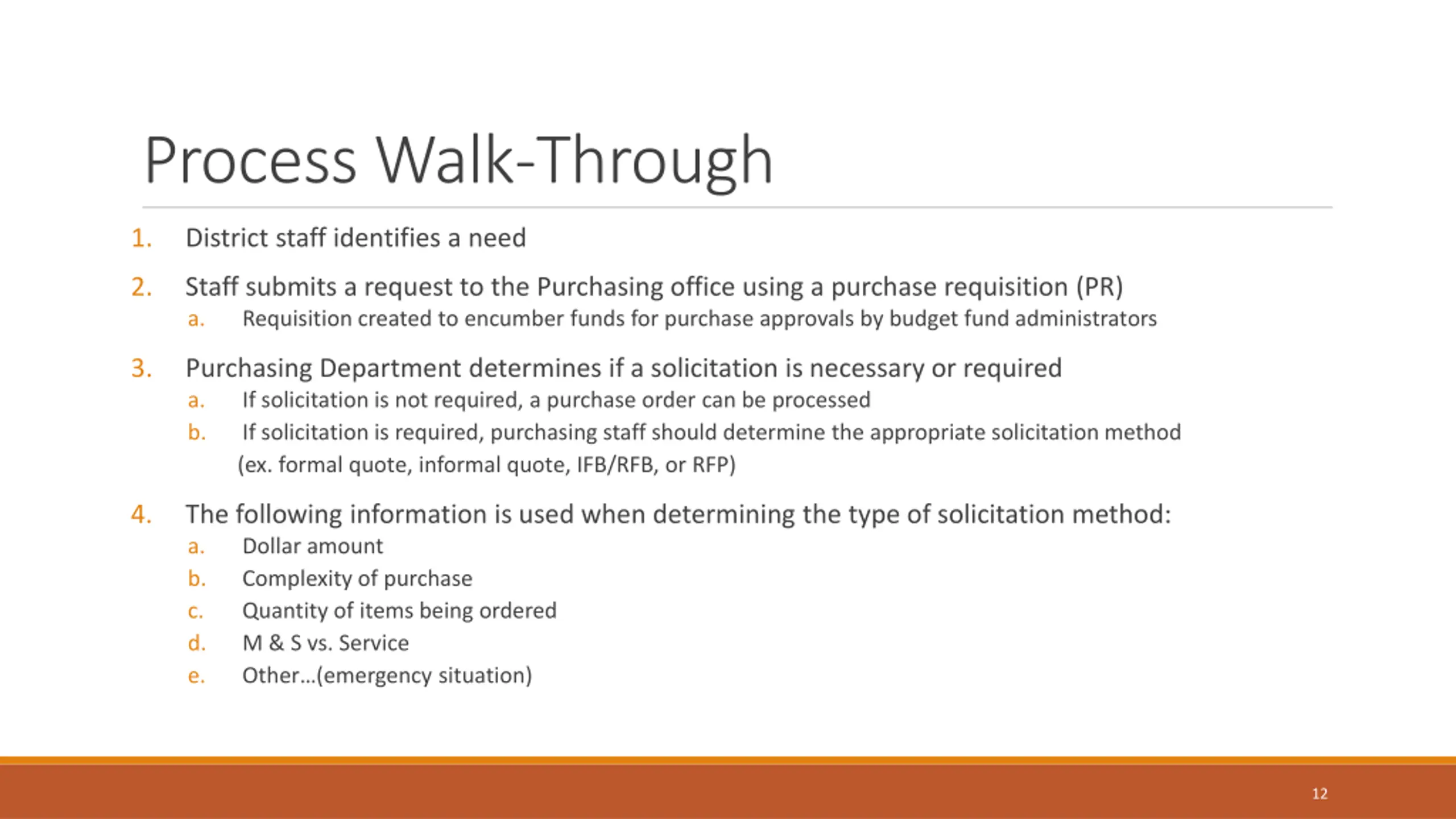 Process Walk-Through 1. District staff identifies a need 2. Staff submits a request to the Purchasing office using a purchase requisition (PR) a. Requisition created to encumber funds for purchase approvals by budget fund administrators 3. Purchasing Department determines if a solicitation is necessary or required a. If solicitation is not required, a purchase order can be processed b. If solicitation is required, purchasing staff should determine the appropriate solicitation method (ex. formal quote, informal quote, IFB/RFB, or RFP) 4. The following information is used when determining the type of solicitation method: a. Dollar amount b. Complexity of purchase c. Quantity of items being ordered d. M & S vs. Service e. Other (emergency situation) 12