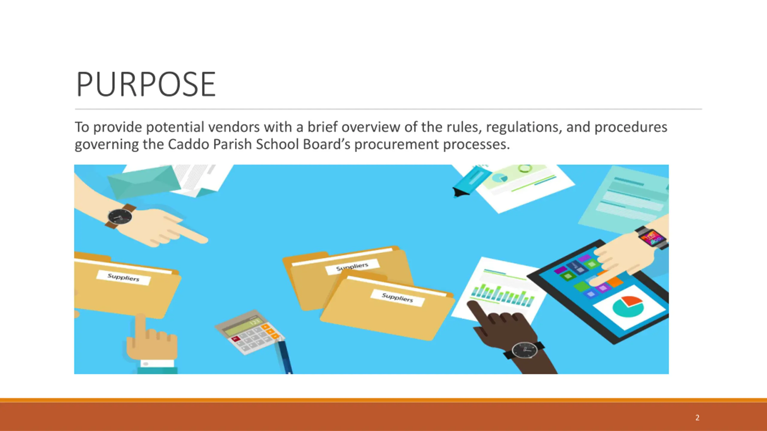 PURPOSE To provide potential vendors with a brief overview of the rules, regulations, and procedures governing the Caddo Parish School Board s procurement processes. 2