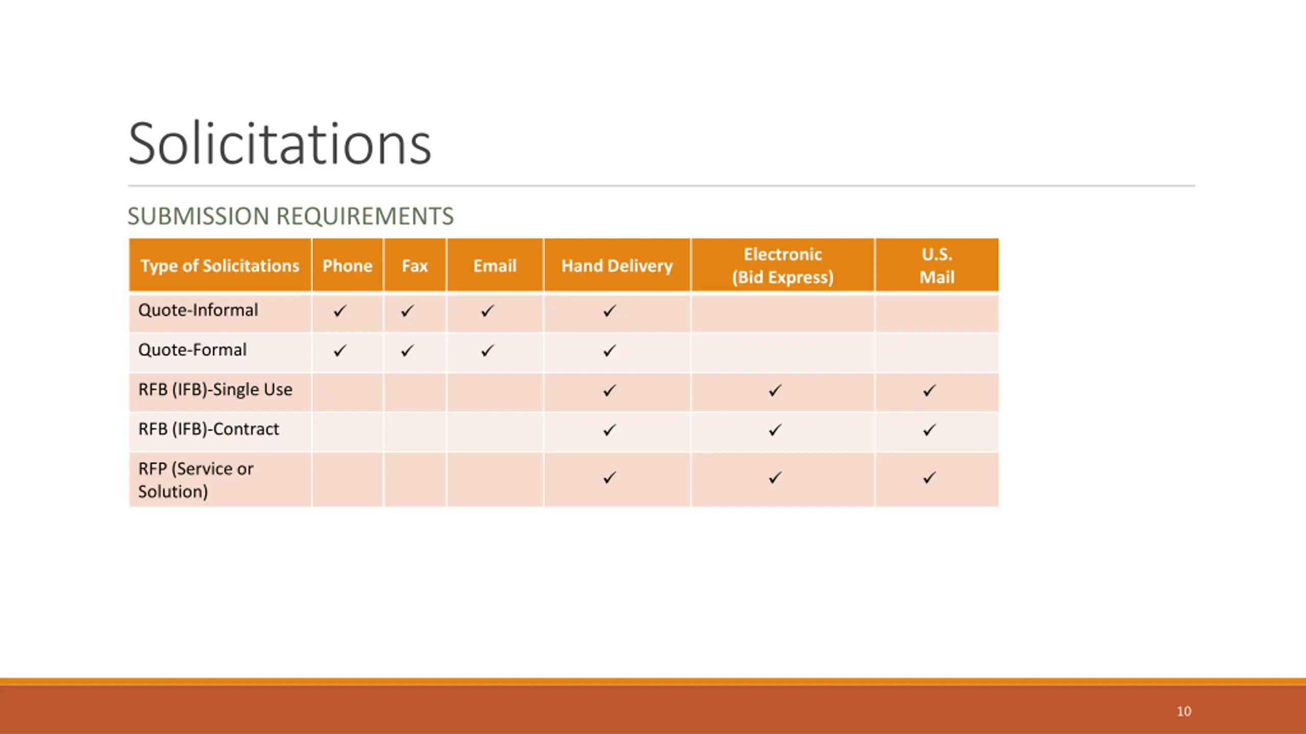 Solicitations SUBMISSION REQUIREMENTS Electronic (Bid Express) U.S. Mail Type of Solicitations Phone Fax Email Hand Delivery Quote-Informal Quote-Formal RFB (IFB)-Single Use RFB (IFB)-Contract RFP (Service or Solution) 10
