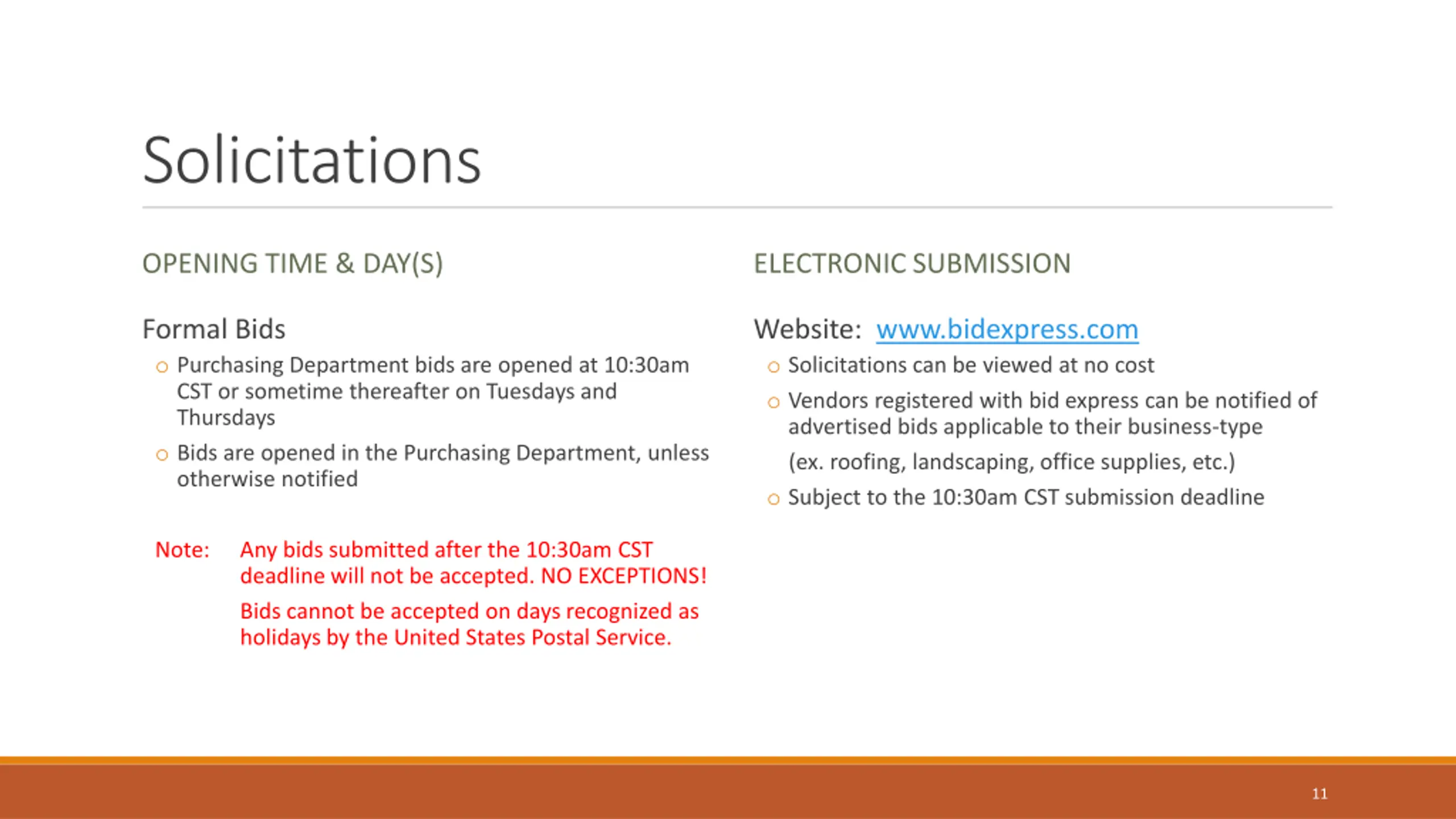 Solicitations OPENING TIME & DAY(S) ELECTRONIC SUBMISSION Formal Bids o Purchasing Department bids are opened at 10:30am CST or sometime thereafter on Tuesdays and Thursdays o Bids are opened in the Purchasing Department, unless otherwise notified Website: www.bidexpress.com o Solicitations can be viewed at no cost o Vendors registered with bid express can be notified of advertised bids applicable to their business-type (ex. roofing, landscaping, office supplies, etc.) o Subject to the 10:30am CST submission deadline Note: Any bids submitted after the 10:30am CST deadline will not be accepted. NO EXCEPTIONS! Bids cannot be accepted on days recognized as holidays by the United States Postal Service. 11