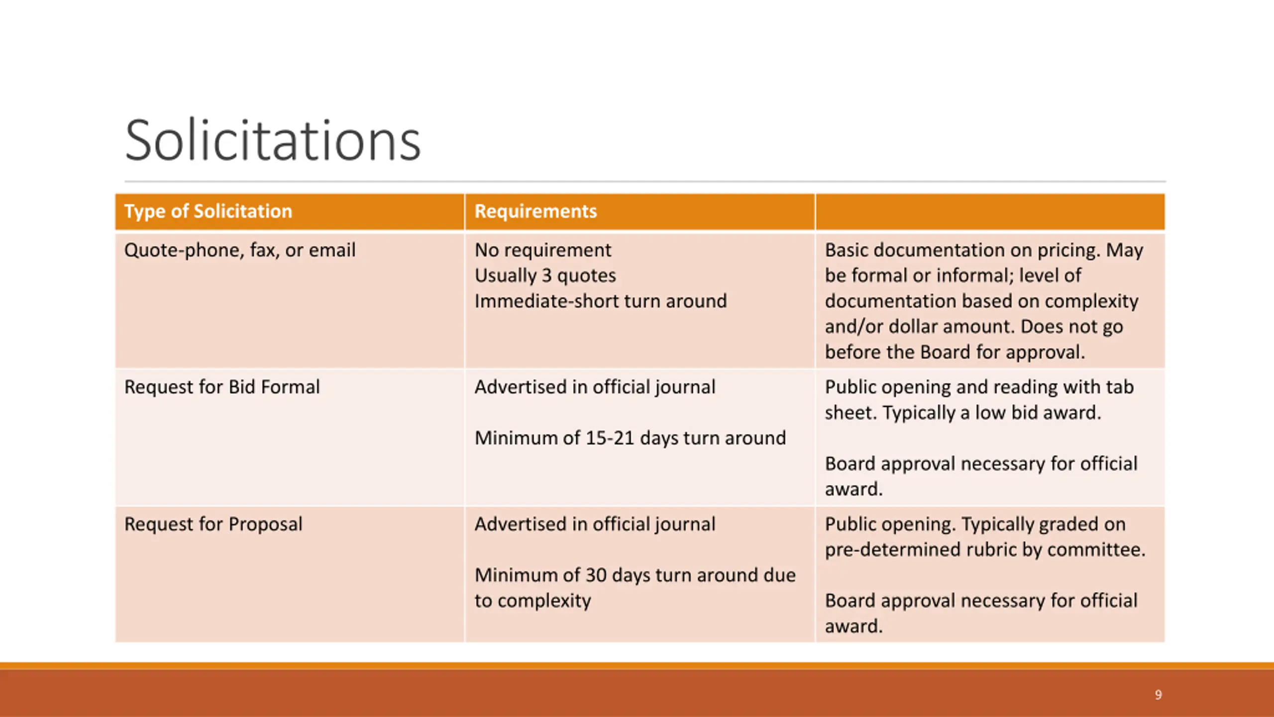 Solicitations Type of Solicitation Requirements Quote-phone, fax, or email No requirement Usually 3 quotes Immediate-short turn around Basic documentation on pricing. May be formal or informal; level of documentation based on complexity and/or dollar amount. Does not go before the Board for approval. Request for Bid Formal Advertised in official journal Public opening and reading with tab sheet. Typically a low bid award. Minimum of 15-21 days turn around Board approval necessary for official award. Request for Proposal Advertised in official journal Public opening. Typically graded on pre-determined rubric by committee. Minimum of 30 days turn around due to complexity Board approval necessary for official award. 9