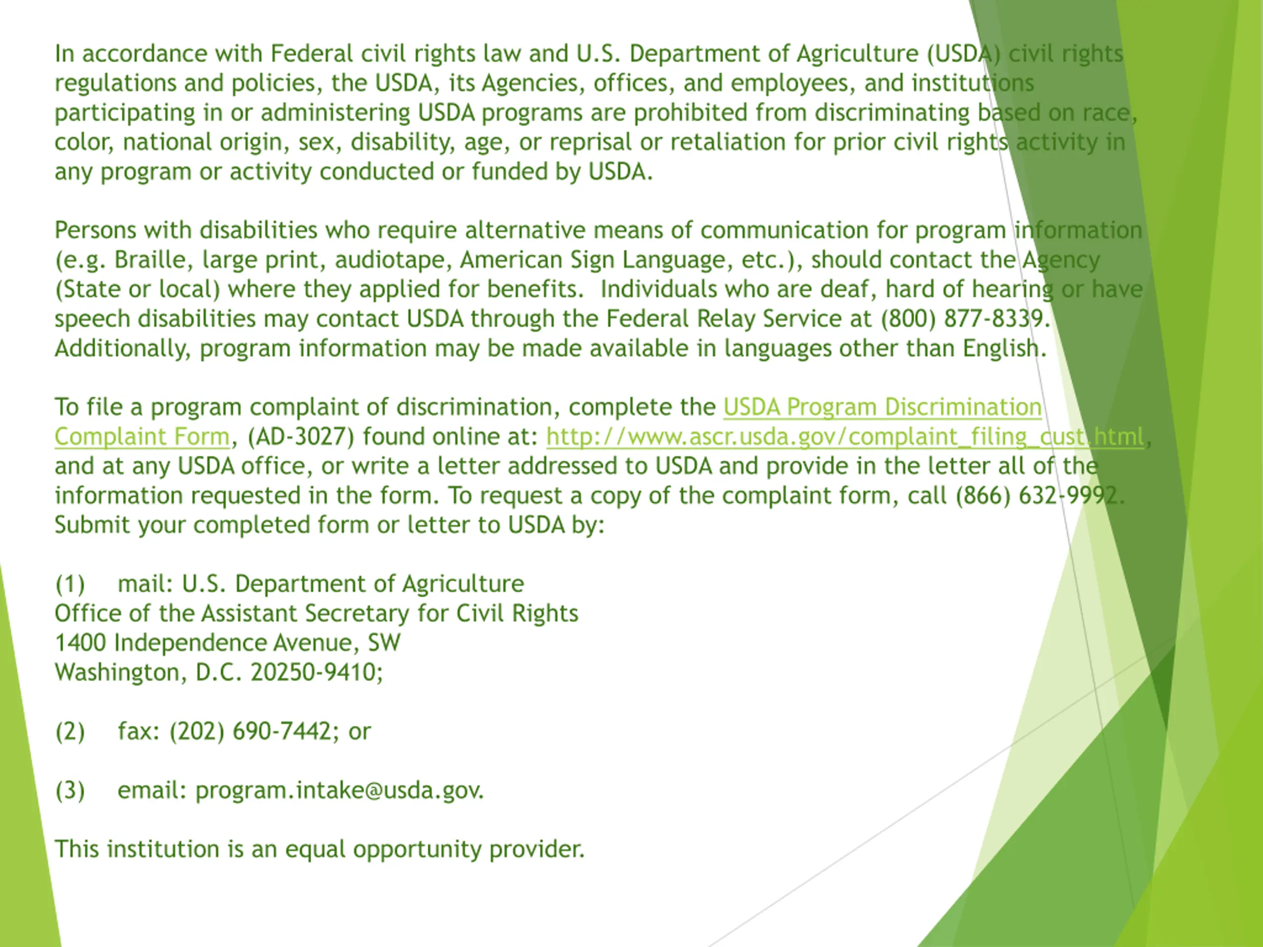 In accordance with Federal civil rights law and U.S. Department of Agriculture (USDA) civil rights regulations and policies, the USDA, its Agencies, offices, and employees, and institutions participating in or administering USDA programs are prohibited from discriminating based on race, color, national origin, sex, disability, age, or reprisal or retaliation for prior civil rights activity in any program or activity conducted or funded by USDA. Persons with disabilities who require alternative means of communication for program information (e.g. Braille, large print, audiotape, American Sign Language, etc.), should contact the Agency (State or local) where they applied for benefits. Individuals who are deaf, hard of hearing or have speech disabilities may contact USDA through the Federal Relay Service at (800) 877-8339. Additionally, program information may be made available in languages other than English. To file a program complaint of discrimination, complete the USDA Program Discrimination Complaint Form, (AD-3027) found online at: http://www.ascr.usda.gov/complaint_filing_cust.html, and at any USDA office, or write a letter addressed to USDA and provide in the letter all of the information requested in the form. To request a copy of the complaint form, call (866) 632-9992. Submit your completed form or letter to USDA by: (1) Office of the Assistant Secretary for Civil Rights 1400 Independence Avenue, SW Washington, D.C. 20250-9410; mail: U.S. Department of Agriculture (2) fax: (202) 690-7442; or (3) email: program.intake@usda.gov. This institution is an equal opportunity provider.
