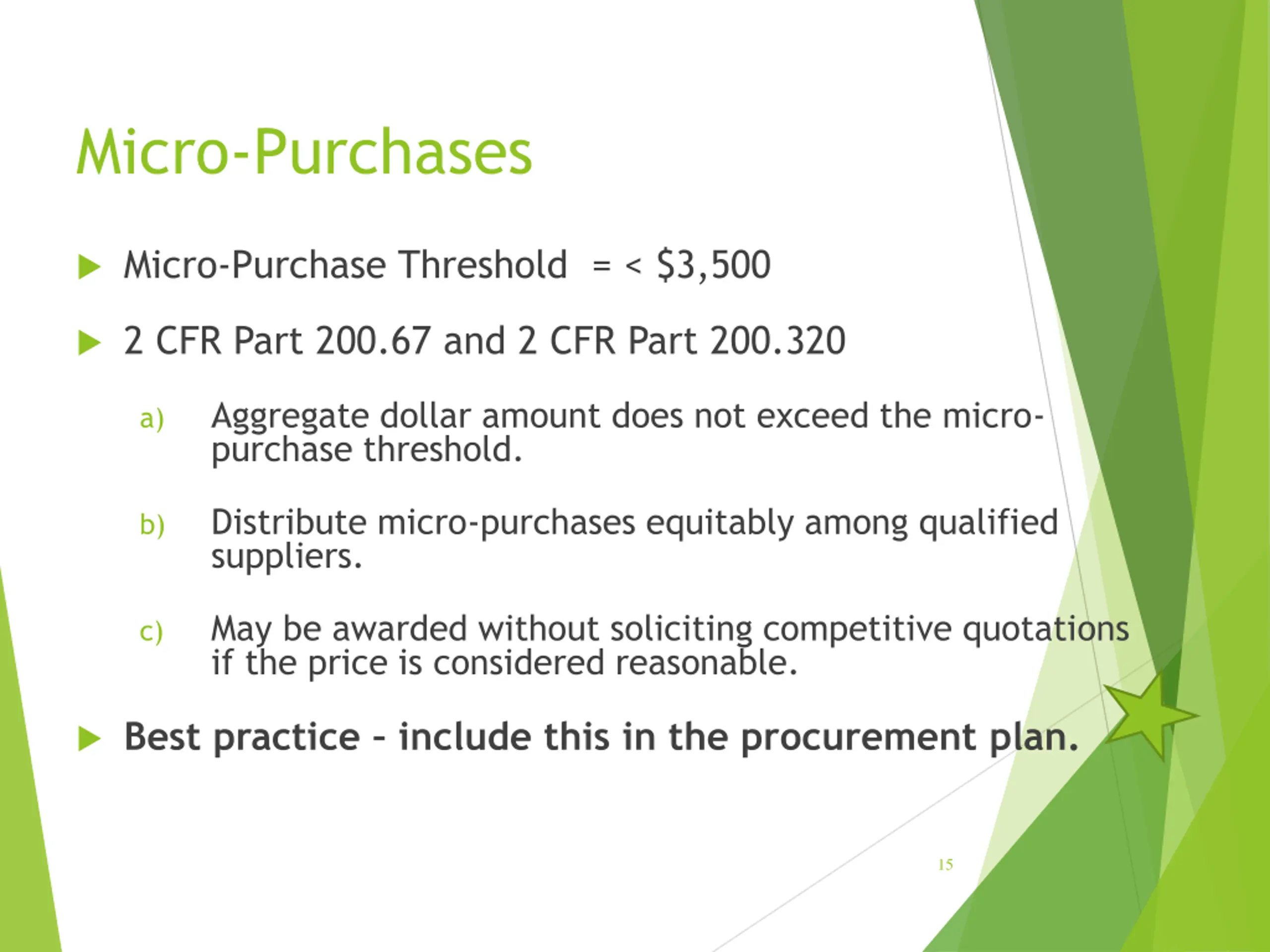 Micro-Purchases Micro-Purchase Threshold = < $3,500 2 CFR Part 200.67 and 2 CFR Part 200.320 Aggregate dollar amount does not exceed the micro- purchase threshold. a) Distribute micro-purchases equitably among qualified suppliers. b) May be awarded without soliciting competitive quotations if the price is considered reasonable. c) Best practice include this in the procurement plan. 15