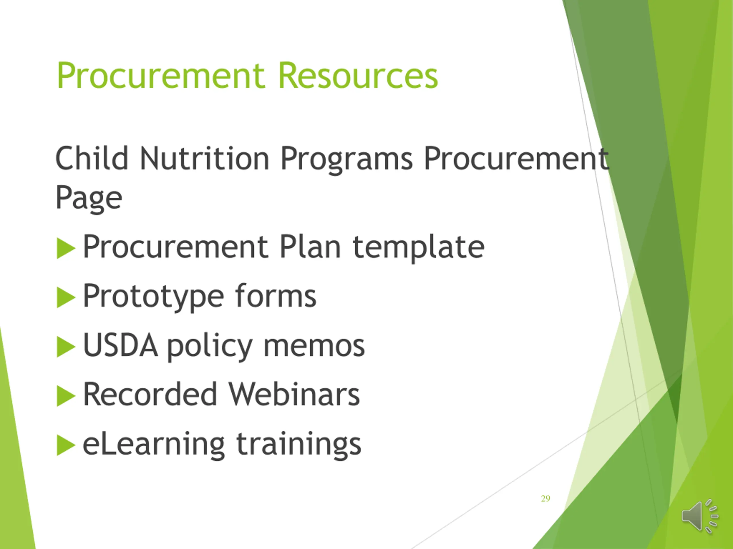 Procurement Resources Child Nutrition Programs Procurement Page Procurement Plan template Prototype forms USDA policy memos Recorded Webinars eLearning trainings 29