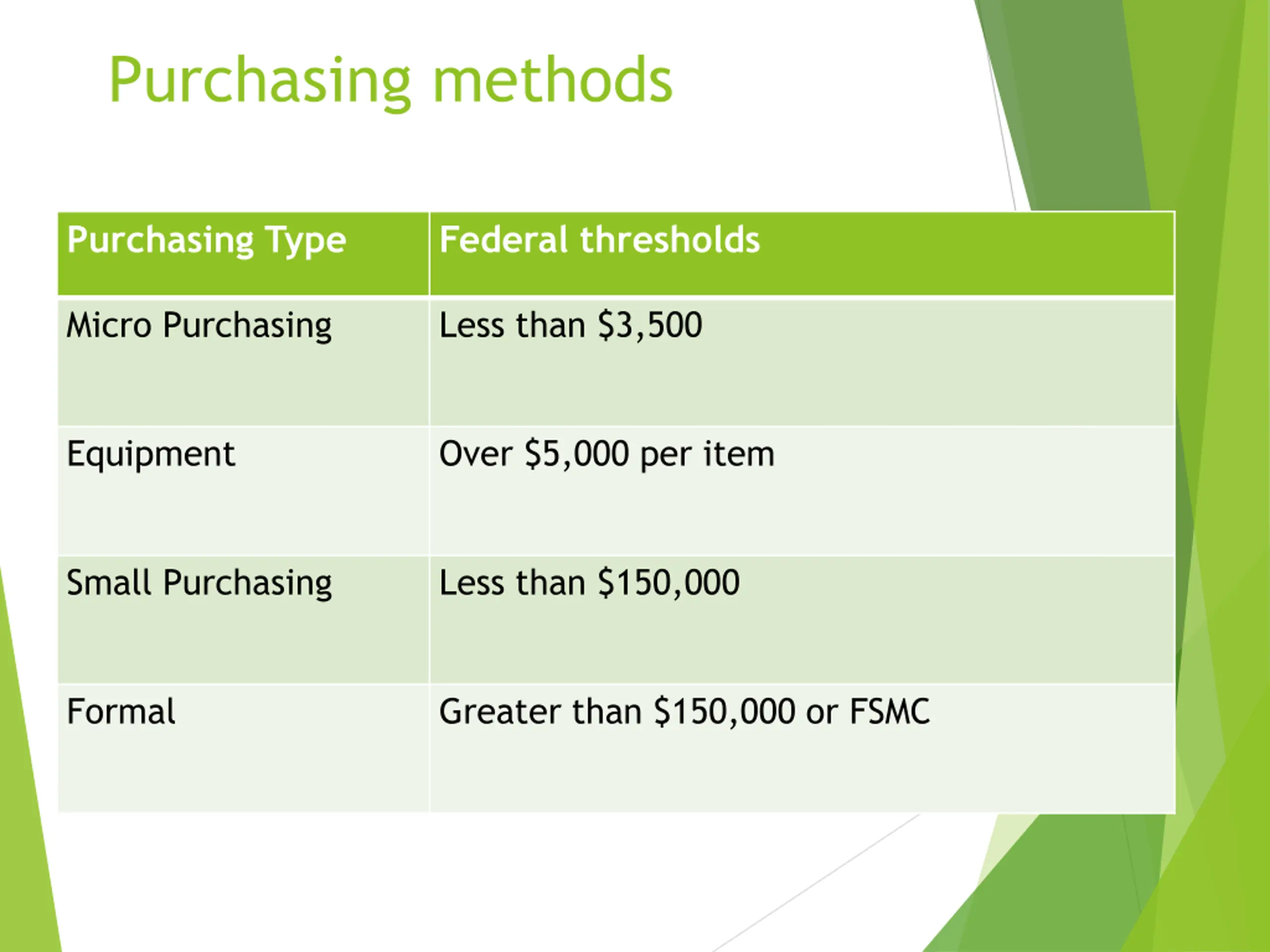 Purchasing methods Purchasing Type Federal thresholds Micro Purchasing Less than $3,500 Equipment Over $5,000 per item Small Purchasing Less than $150,000 Formal Greater than $150,000 or FSMC