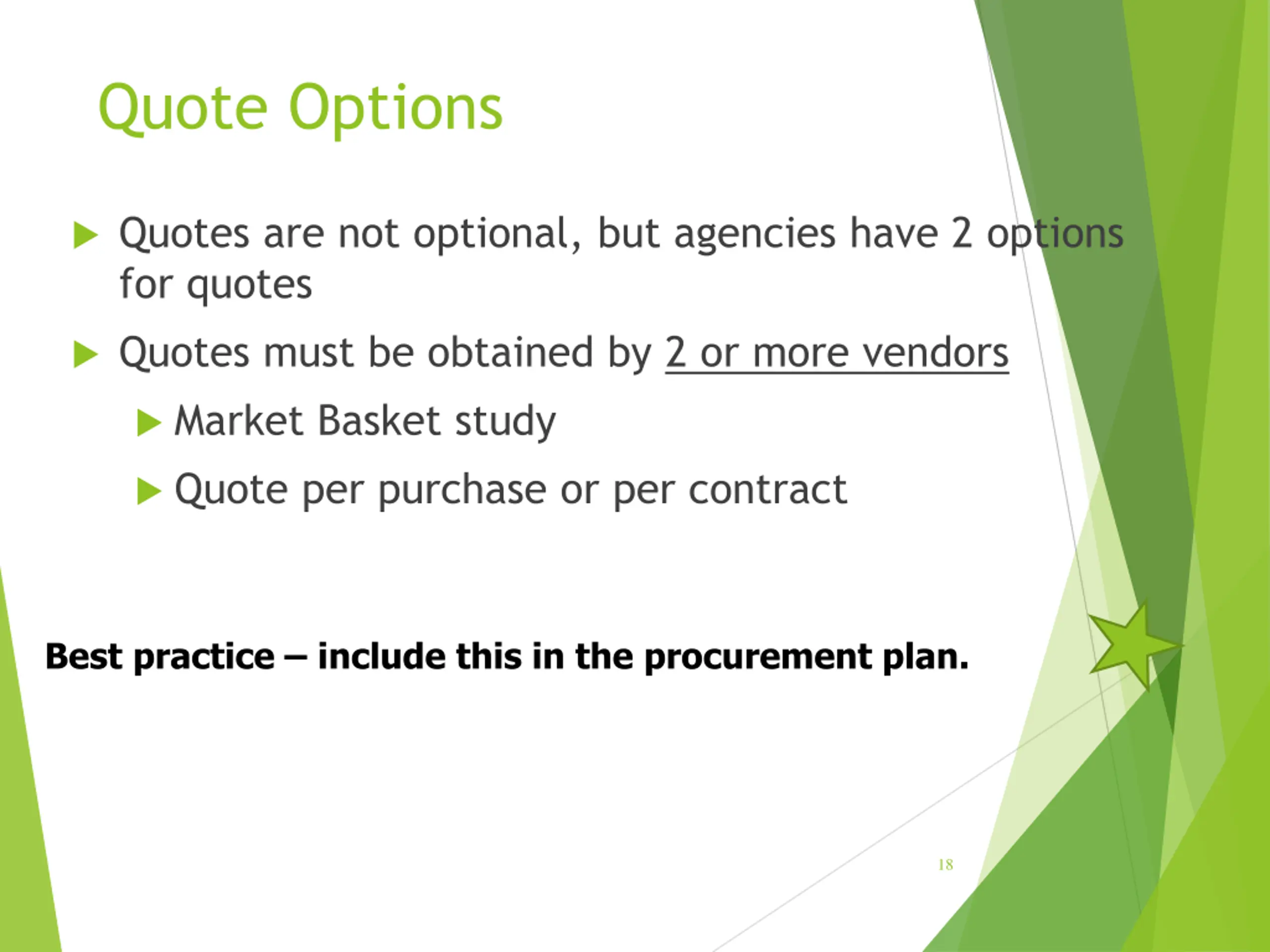Quote Options Quotes are not optional, but agencies have 2 options for quotes Quotes must be obtained by 2 or more vendors Market Basket study Quote per purchase or per contract Best practice include this in the procurement plan. 18