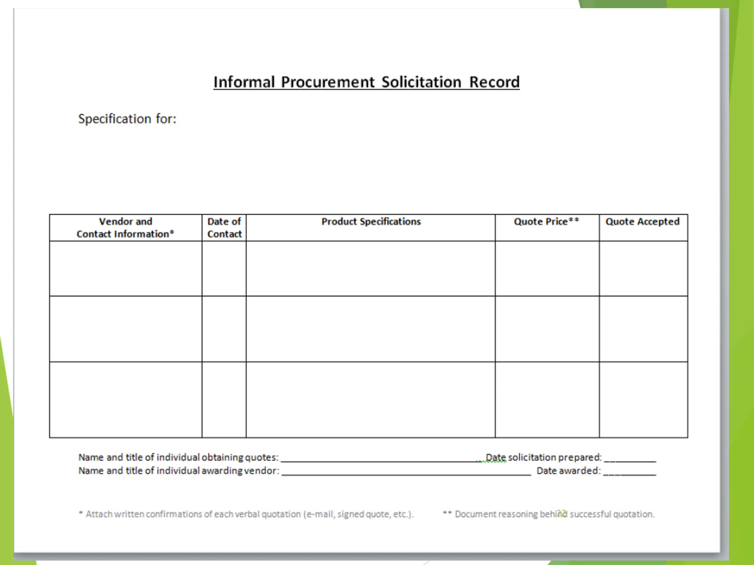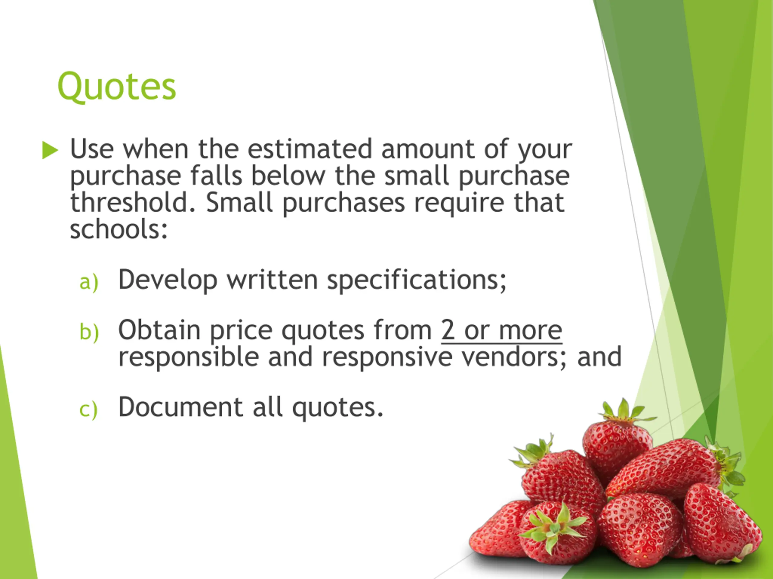 Quotes Use when the estimated amount of your purchase falls below the small purchase threshold. Small purchases require that schools: a) Develop written specifications; b) Obtain price quotes from 2 or more responsible and responsive vendors; and c) Document all quotes. 21