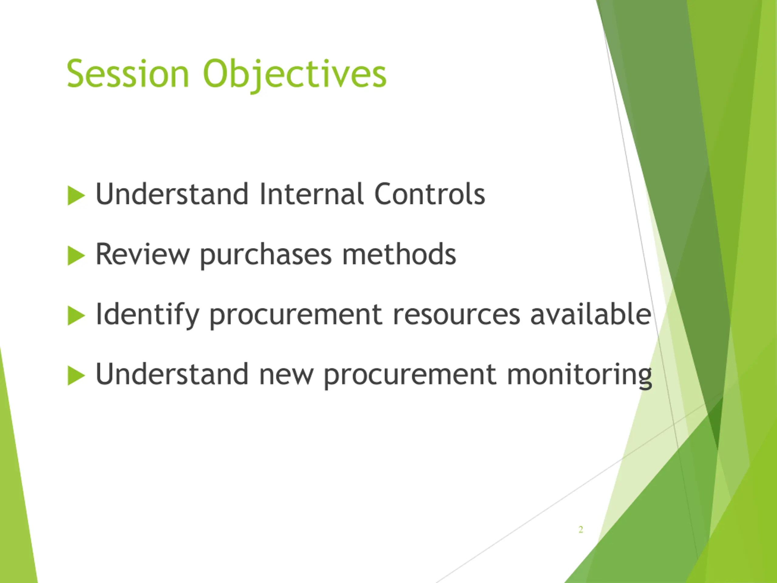 Session Objectives Understand Internal Controls Review purchases methods Identify procurement resources available Understand new procurement monitoring 2