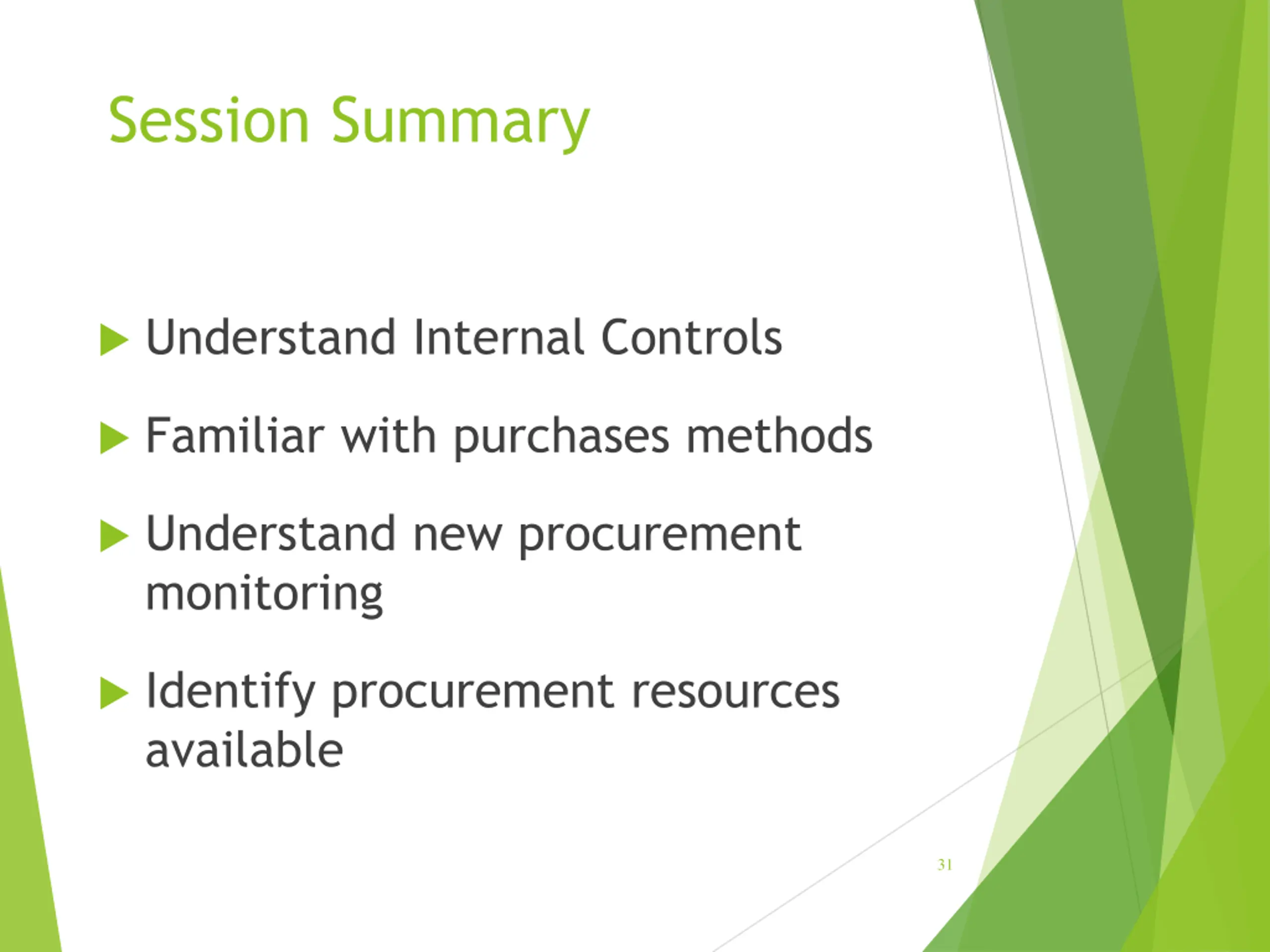 Session Summary Understand Internal Controls Familiar with purchases methods Understand new procurement monitoring Identify procurement resources available 31
