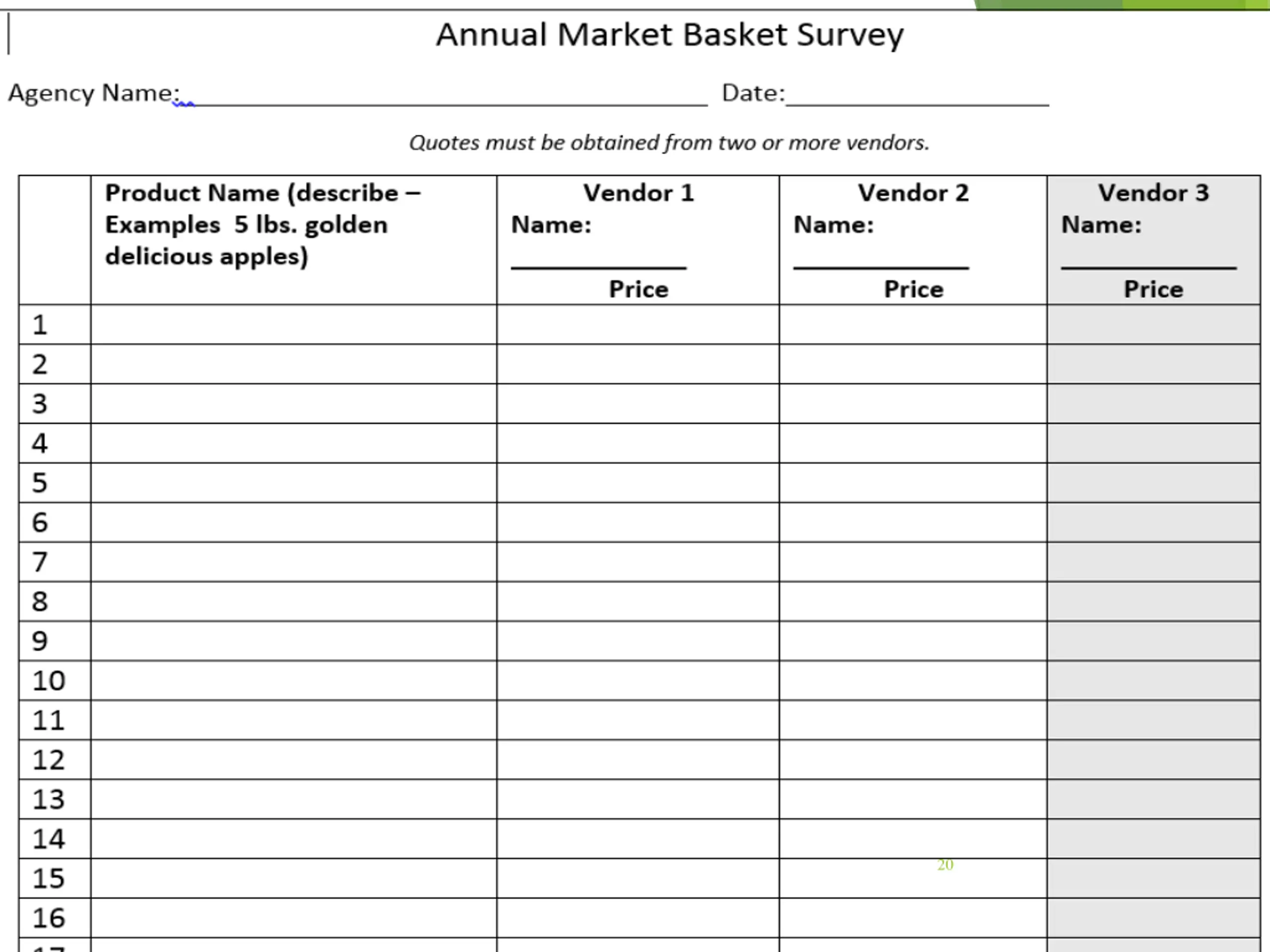 Market Basket Study Used for informal procurement only <$150,000 List the top purchased items Purchased most frequently no less than 20 items Greatest purchased amounts i.e. an agency may purchase more cases of crackers than ground beef, but ground beef is a higher portion of the food budget Select 2 or more vendors/stores for quotes Must be conducted annually 19