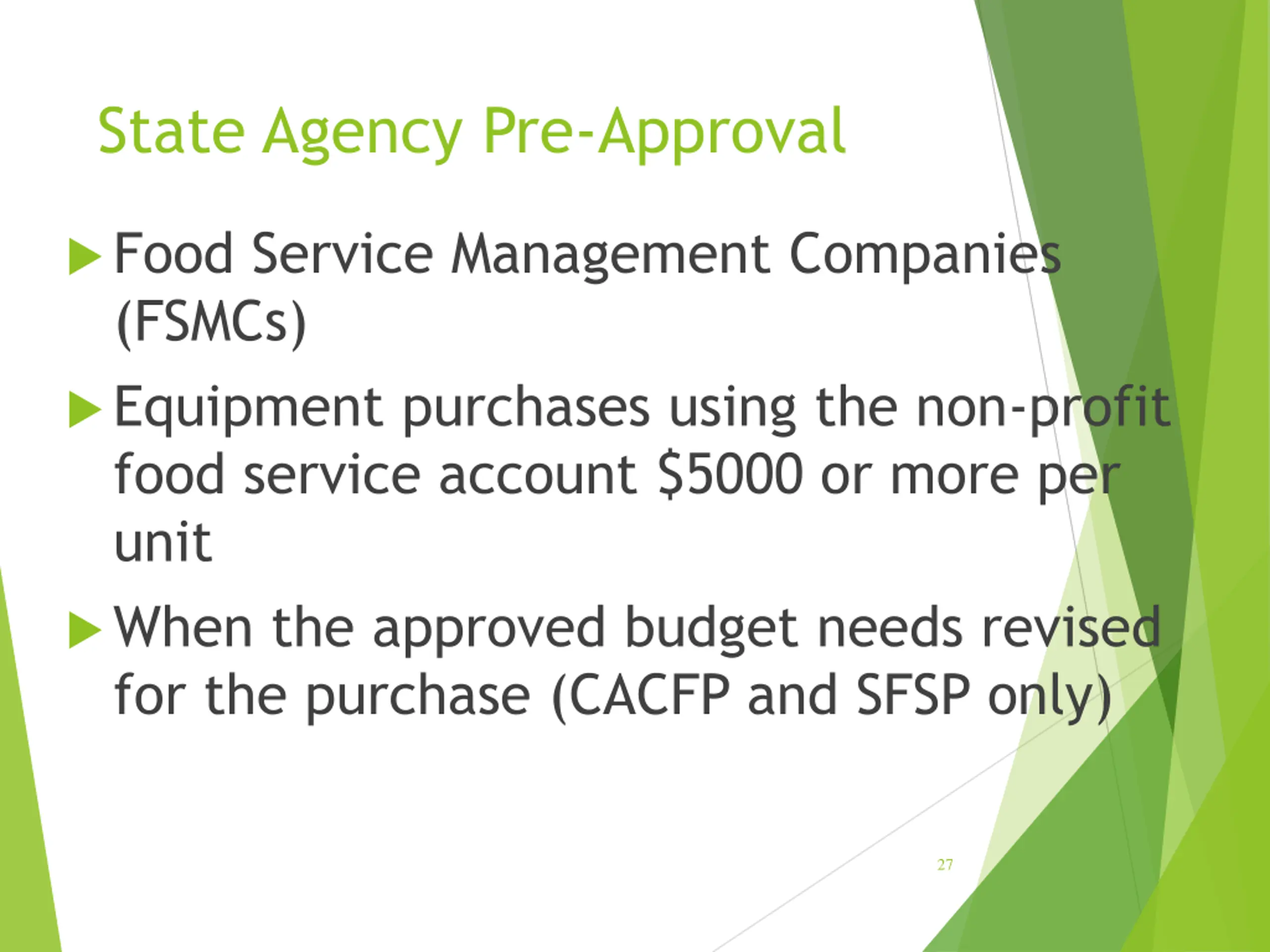 State Agency Pre-Approval Food Service Management Companies (FSMCs) Equipment purchases using the non-profit food service account $5000 or more per unit When the approved budget needs revised for the purchase (CACFP and SFSP only) 27