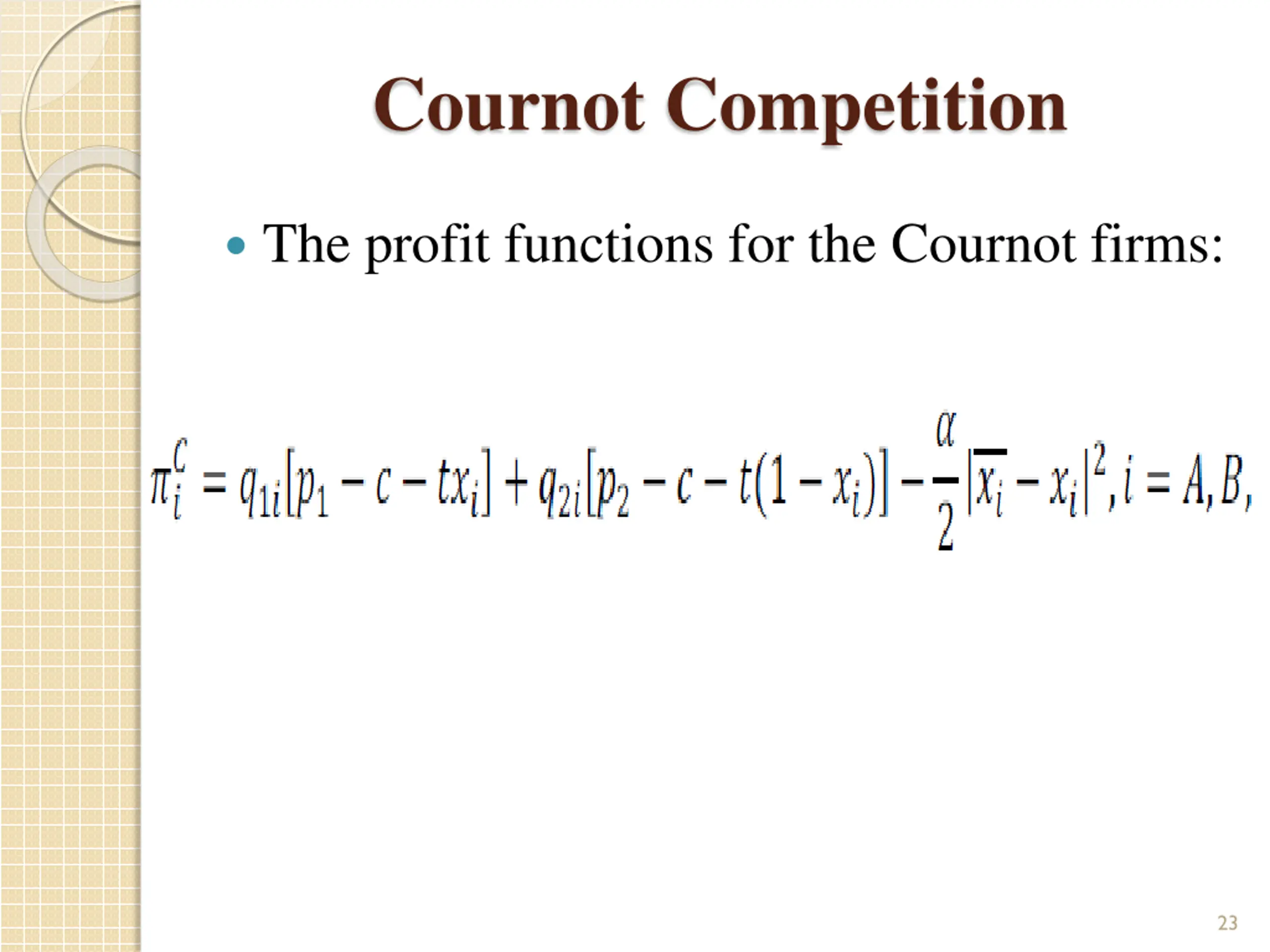 Cournot Competition The profit functions for the Cournot firms: 23