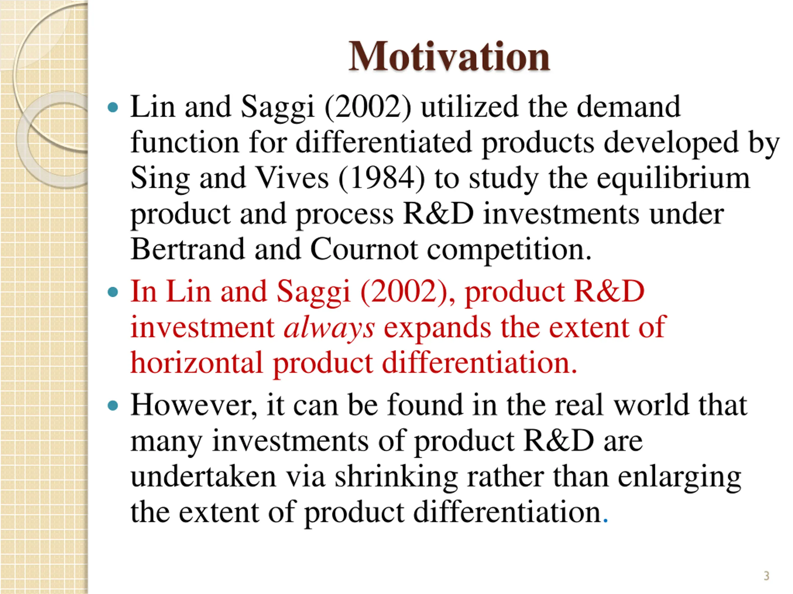 Motivation Lin and Saggi (2002) utilized the demand function for differentiated products developed by Sing and Vives (1984) to study the equilibrium product and process R&D investments under Bertrand and Cournot competition. In Lin and Saggi (2002), product R&D investment always expands the extent of horizontal product differentiation. However, it can be found in the real world that many investments of product R&D are undertaken via shrinking rather than enlarging the extent of product differentiation. 3