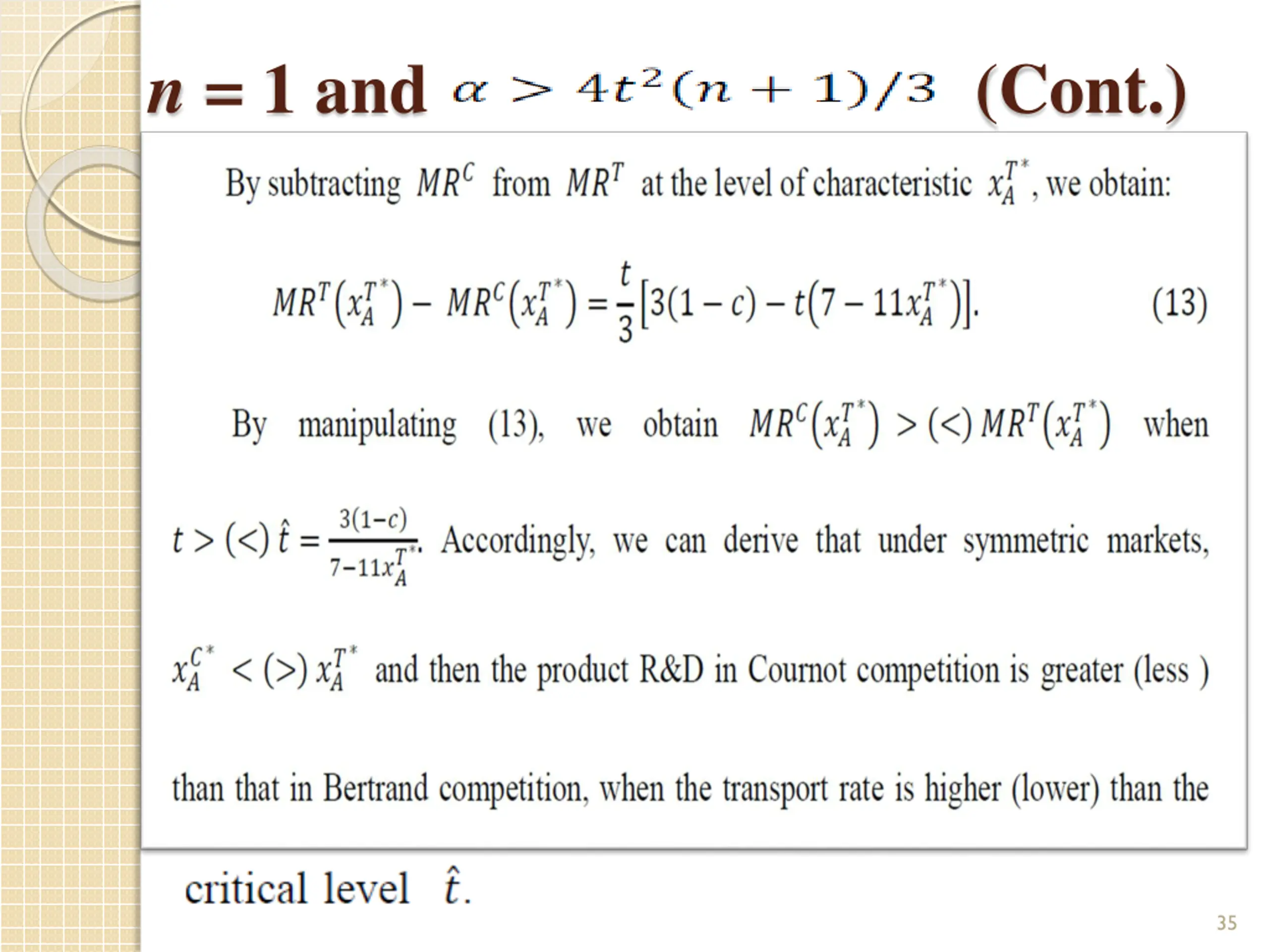 The Case of and n > n the optimal characteristic combination under Bertrand competition is while that under Cournot competition is The product R&D investments under Cournot competition are greater than those under Bertrand competition, because 32