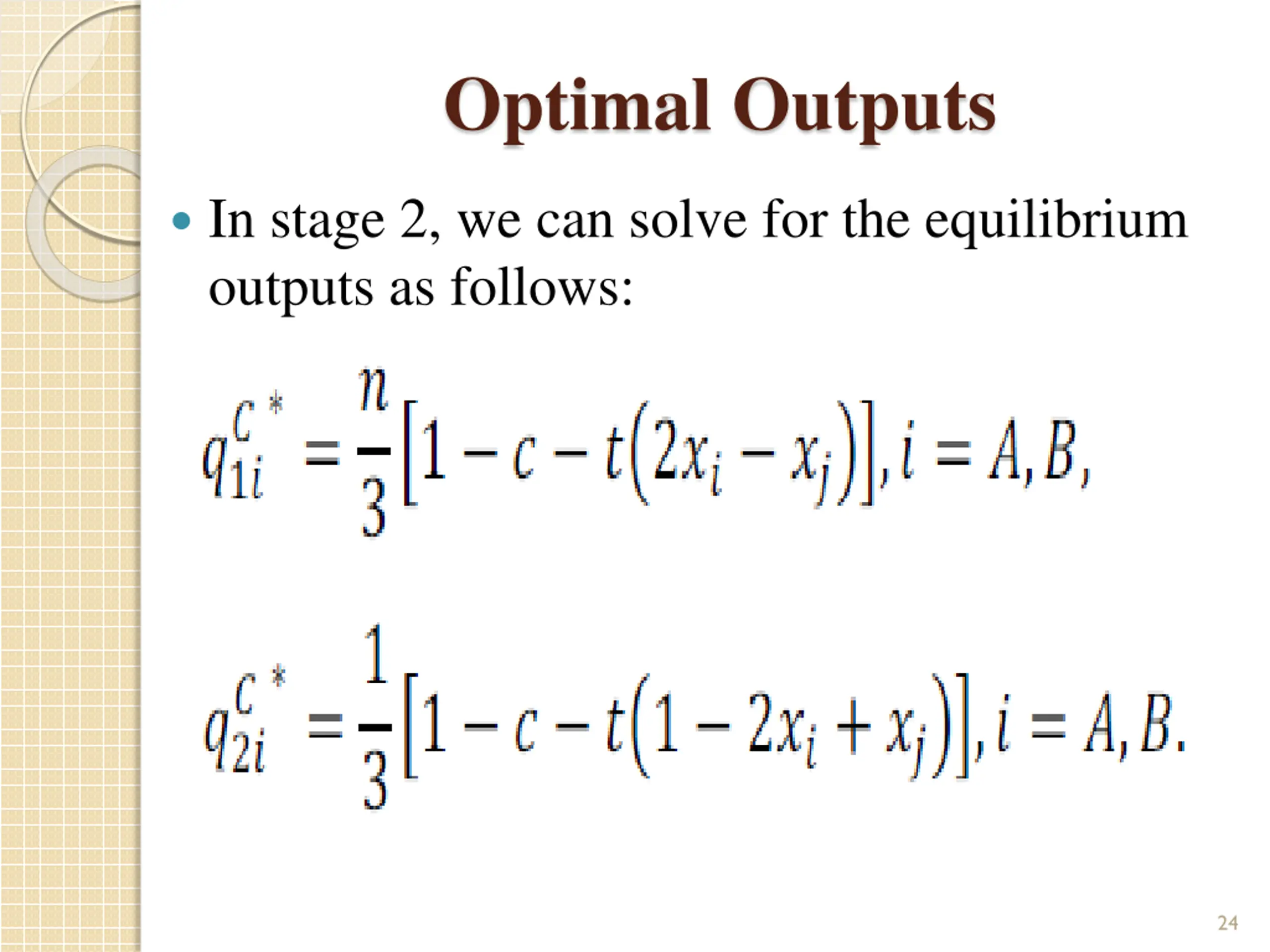Optimal Outputs In stage 2, we can solve for the equilibrium outputs as follows: 24