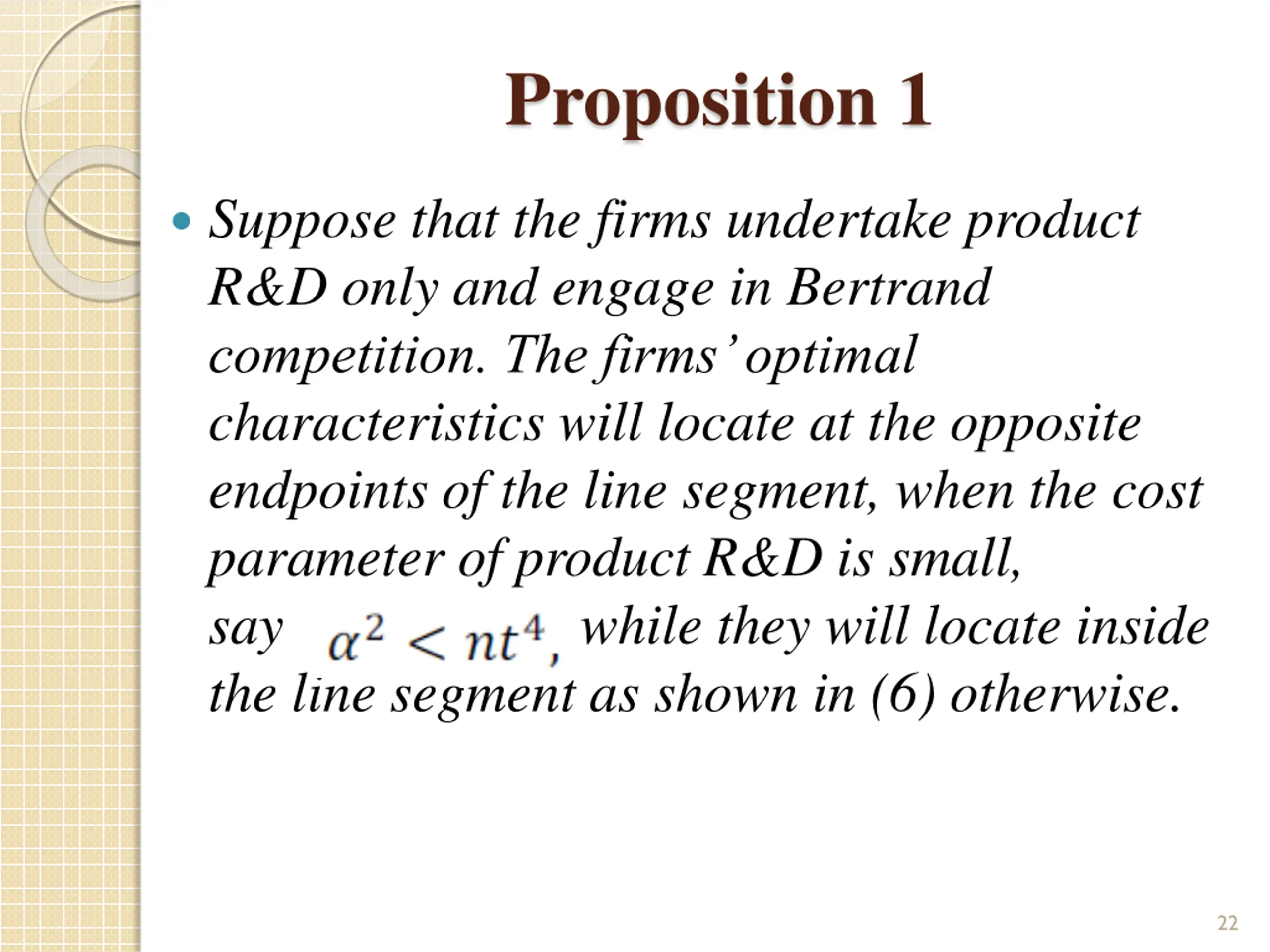 Proposition 1 Suppose that the firms undertake product R&D only and engage in Bertrand competition. The firms optimal characteristics will locate at the opposite endpoints of the line segment, when the cost parameter of product R&D is small, say , while they will locate inside the line segment as shown in (6) otherwise. 22