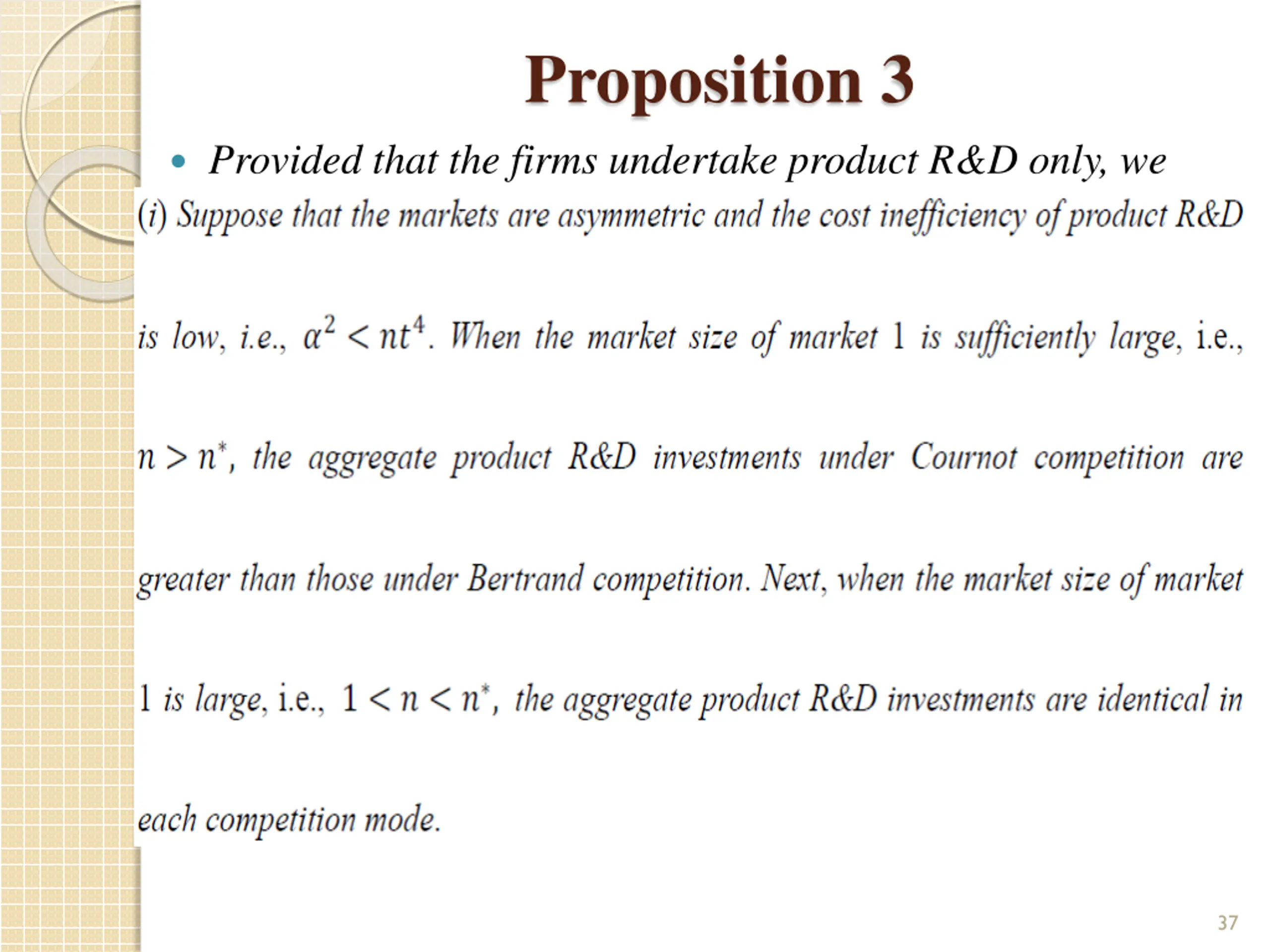 Proposition 2. Suppose that the firms undertake product R&D only and engage in Cournot competition. We can propose: 31