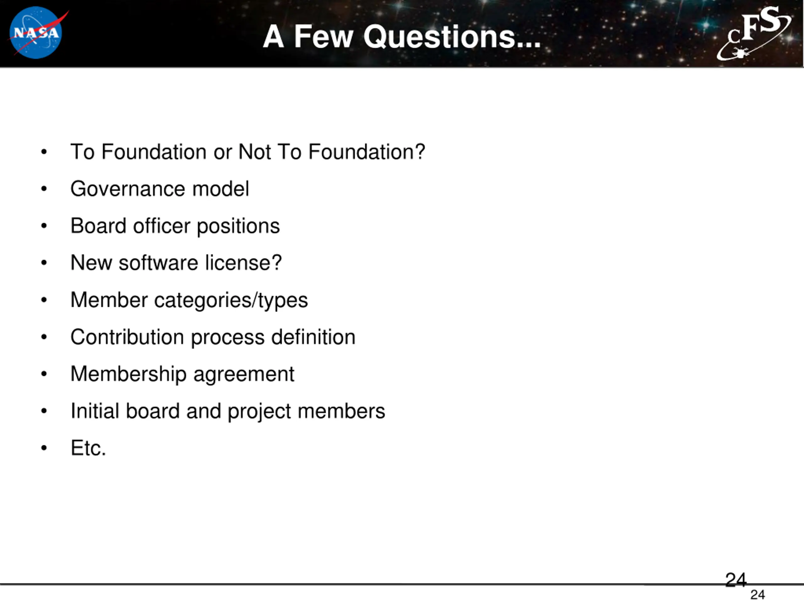 A Few Questions... To Foundation or Not To Foundation? Governance model Board officer positions New software license? Member categories/types Contribution process definition Membership agreement Initial board and project members Etc. 24 24