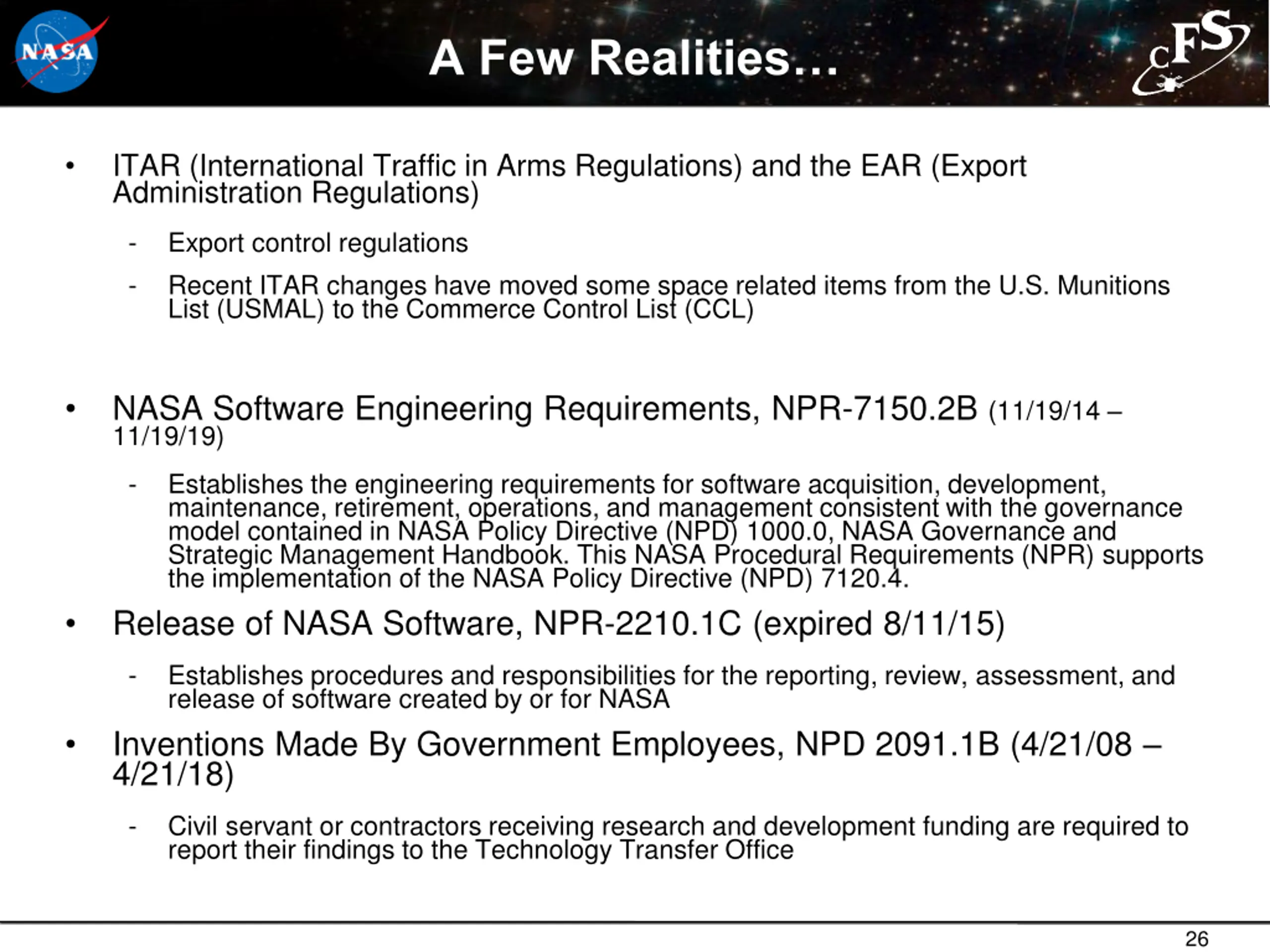 A Few Realities ITAR (International Traffic in Arms Regulations) and the EAR (Export Administration Regulations) - - Export control regulations Recent ITAR changes have moved some space related items from the U.S. Munitions List (USMAL) to the Commerce Control List (CCL) NASA Software Engineering Requirements, NPR-7150.2B (11/19/14 11/19/19) Establishes the engineering requirements for software acquisition, development, maintenance, retirement, operations, and management consistent with the governance model contained in NASA Policy Directive (NPD) 1000.0, NASA Governance and Strategic Management Handbook. This NASA Procedural Requirements (NPR) supports the implementation of the NASA Policy Directive (NPD) 7120.4. Release of NASA Software, NPR-2210.1C (expired 8/11/15) - Establishes procedures and responsibilities for the reporting, review, assessment, and release of software created by or for NASA Inventions Made By Government Employees, NPD 2091.1B (4/21/08 4/21/18) - - Civil servant or contractors receiving research and development funding are required to report their findings to the Technology Transfer Office 26