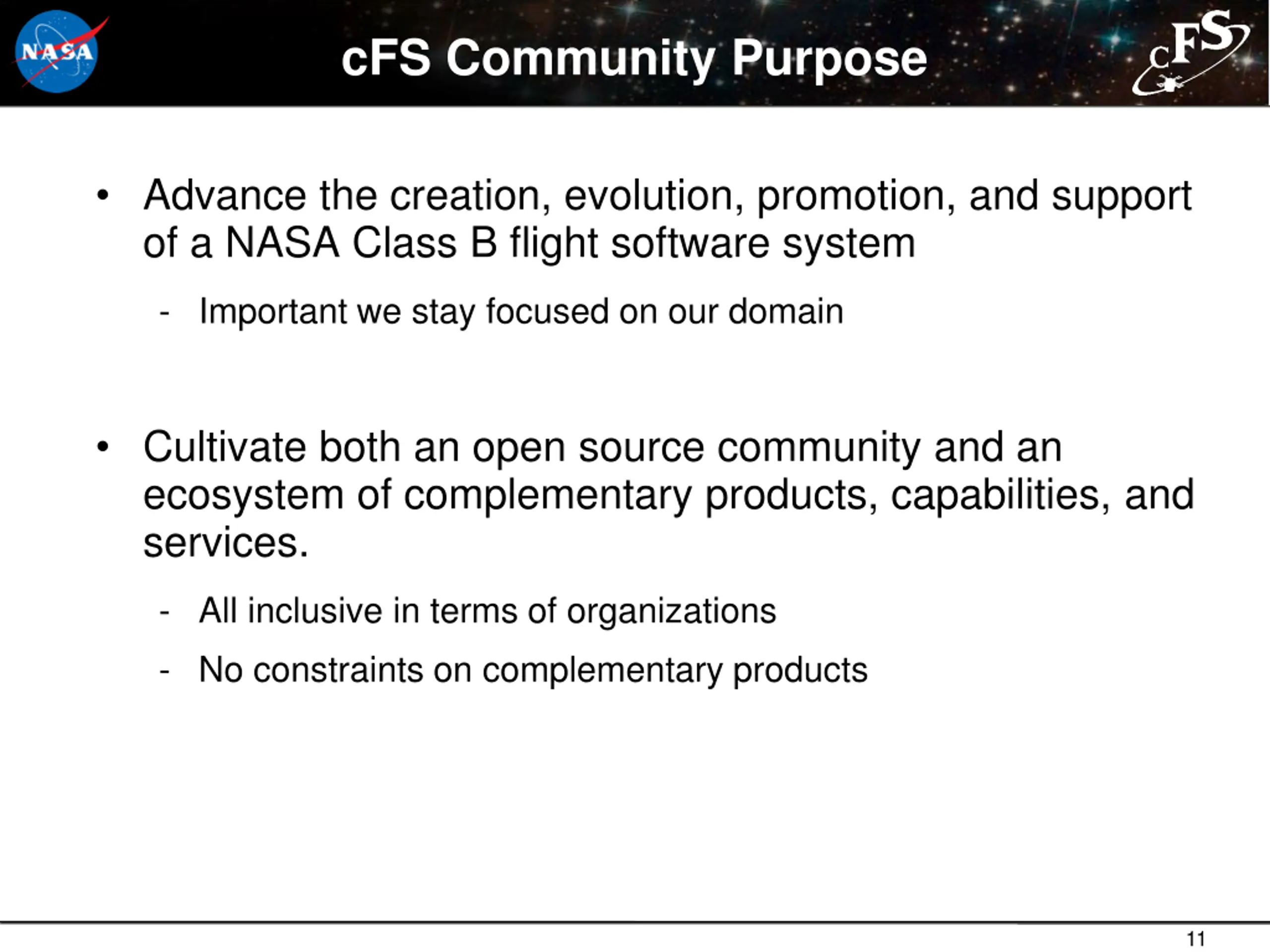 cFS Community Purpose Advance the creation, evolution, promotion, and support of a NASA Class B flight software system - Important we stay focused on our domain Cultivate both an open source community and an ecosystem of complementary products, capabilities, and services. - All inclusive in terms of organizations - No constraints on complementary products 11