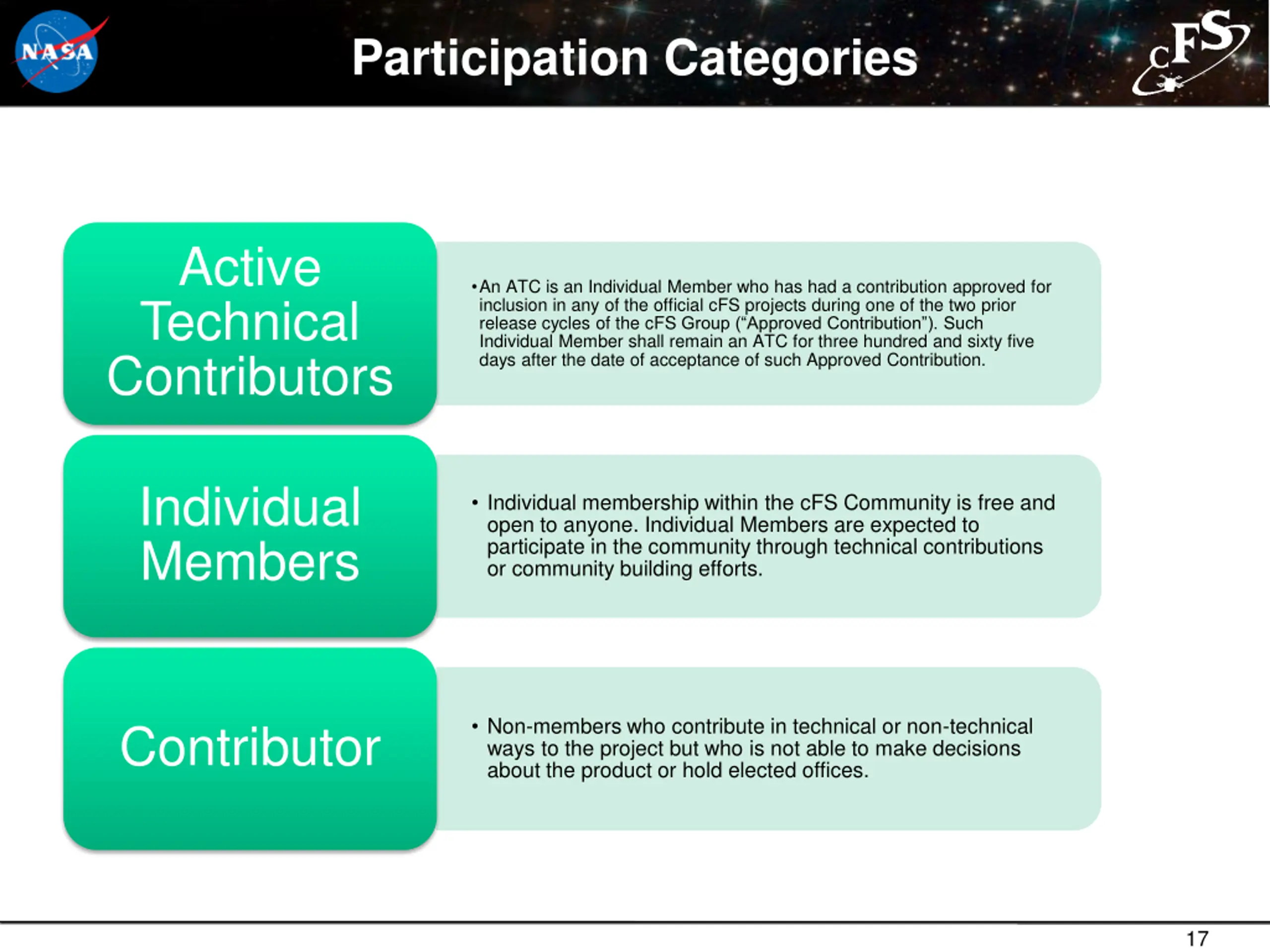 Participation Categories Active Technical Contributors An ATC is an Individual Member who has had a contribution approved for inclusion in any of the official cFS projects during one of the two prior release cycles of the cFS Group ( Approved Contribution ). Such Individual Member shall remain an ATC for three hundred and sixty five days after the date of acceptance of such Approved Contribution. Individual Members Individual membership within the cFS Community is free and open to anyone. Individual Members are expected to participate in the community through technical contributions or community building efforts. Non-members who contribute in technical or non-technical ways to the project but who is not able to make decisions about the product or hold elected offices. Contributor 17