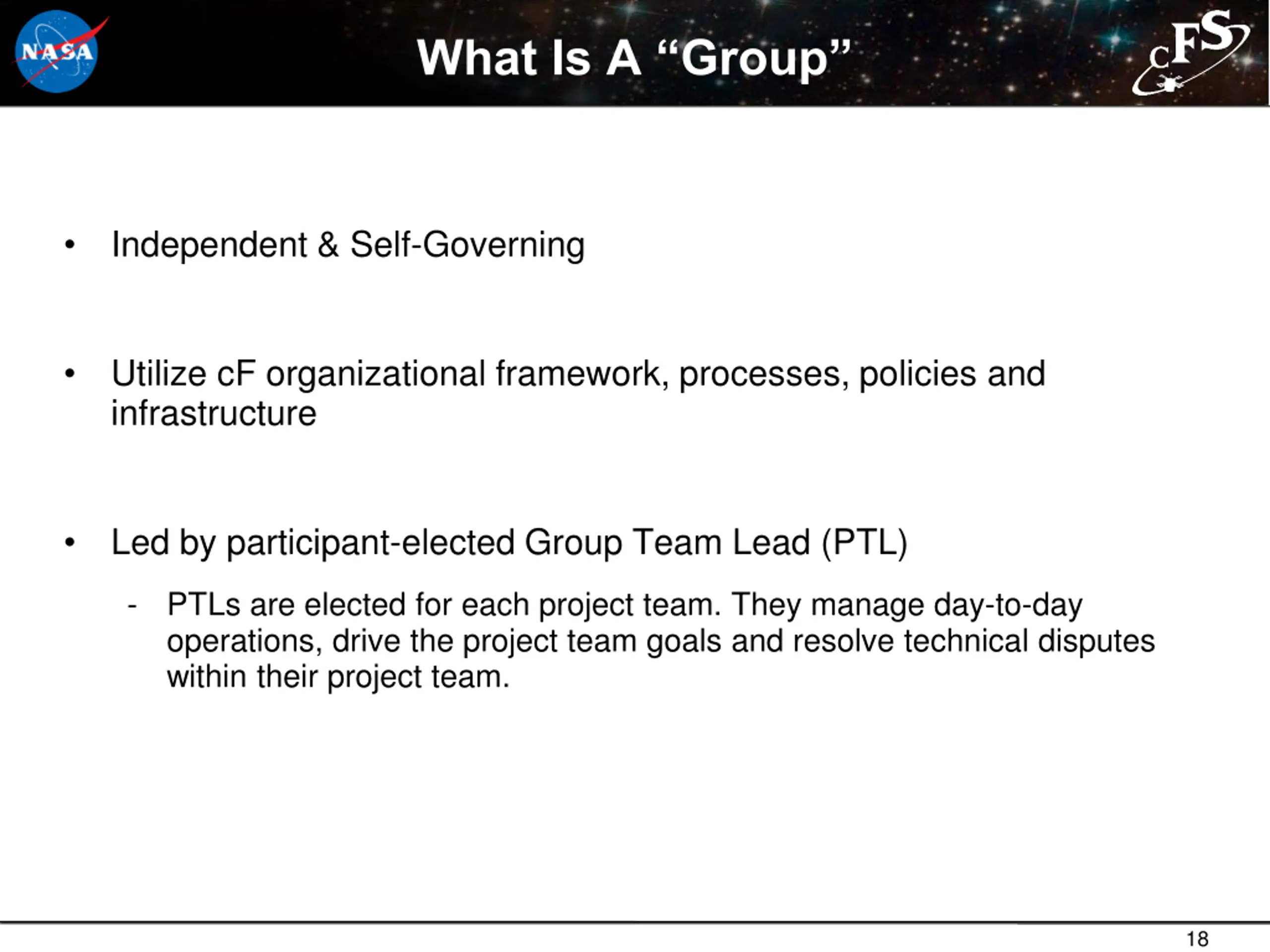 What Is A Group Independent & Self-Governing Utilize cF organizational framework, processes, policies and infrastructure Led by participant-elected Group Team Lead (PTL) - PTLs are elected for each project team. They manage day-to-day operations, drive the project team goals and resolve technical disputes within their project team. 18