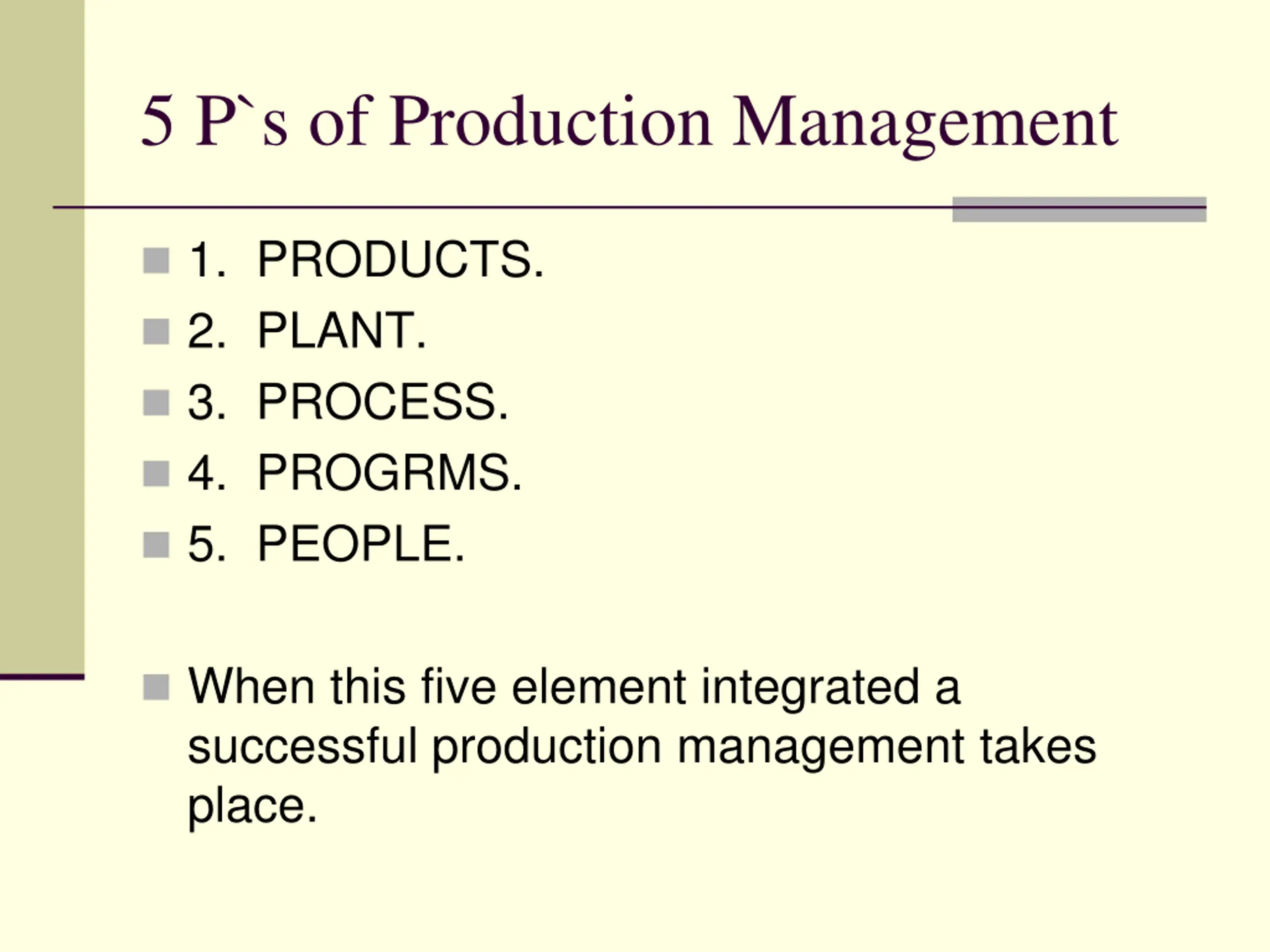 5 P`s of Production Management 1. PRODUCTS. 2. PLANT. 3. PROCESS. 4. PROGRMS. 5. PEOPLE. When this five element integrated a successful production management takes place.