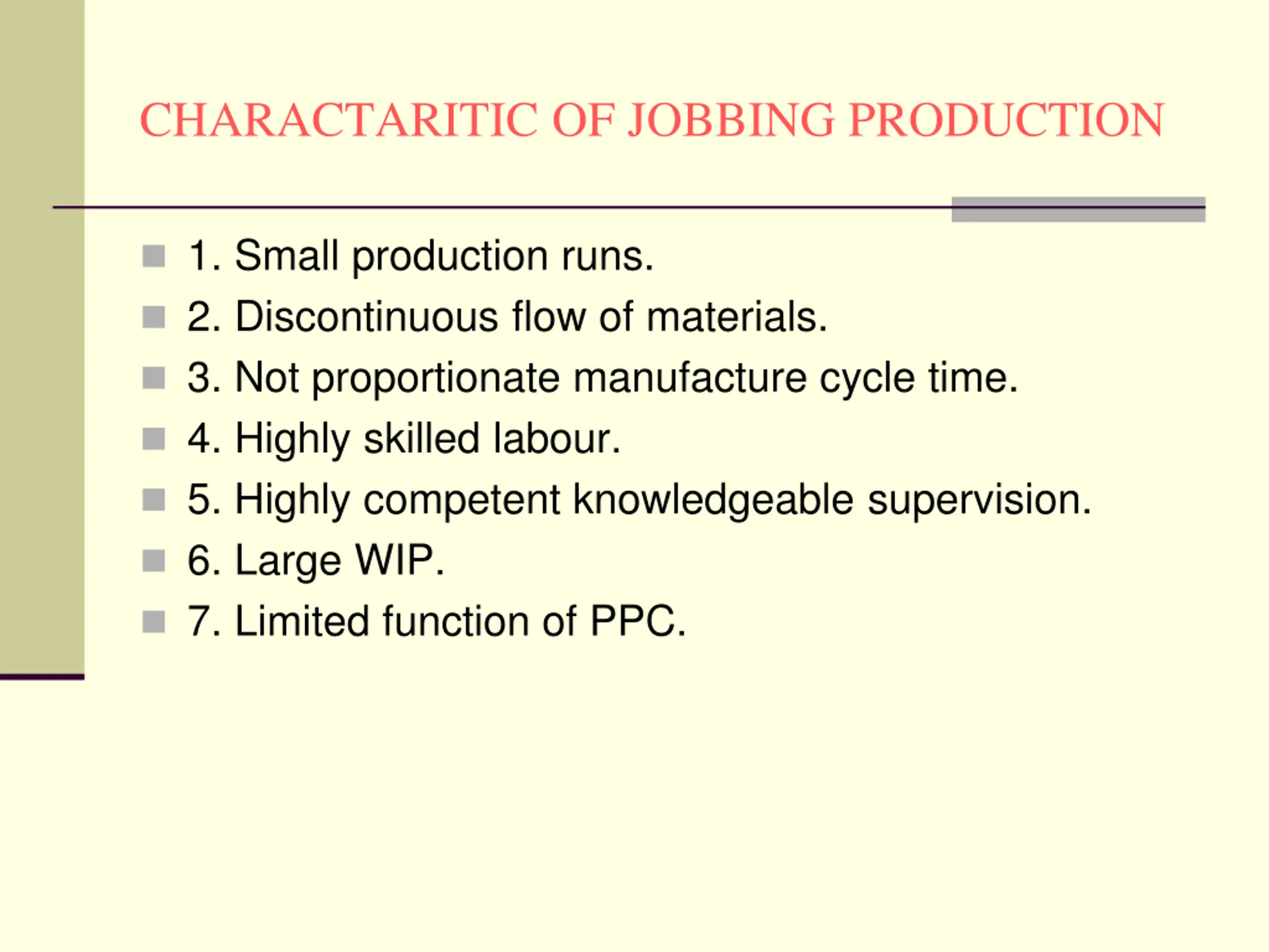 CHARACTARITIC OF JOBBING PRODUCTION 1. Small production runs. 2. Discontinuous flow of materials. 3. Not proportionate manufacture cycle time. 4. Highly skilled labour. 5. Highly competent knowledgeable supervision. 6. Large WIP. 7. Limited function of PPC.