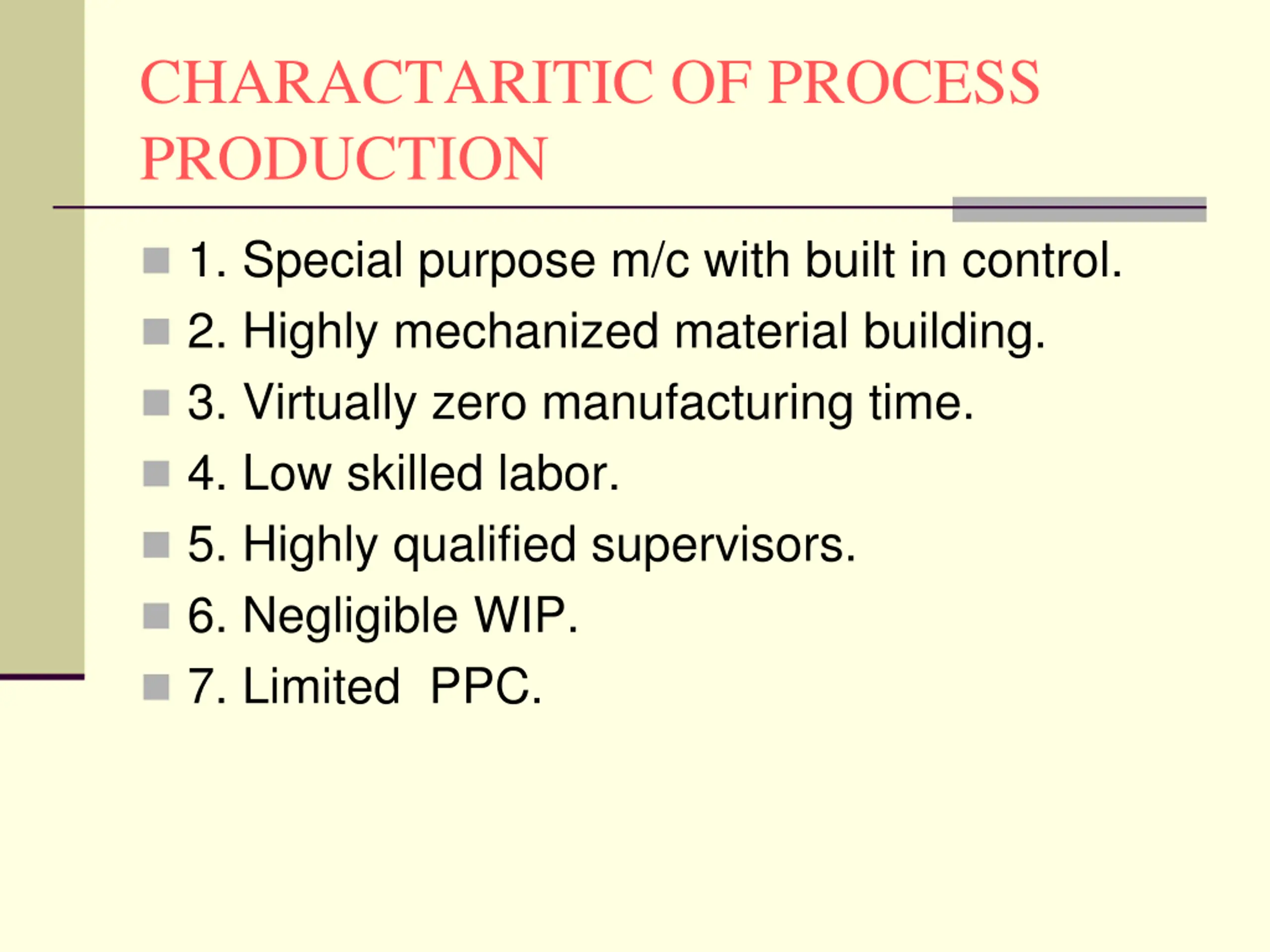 CHARACTARITIC OF PROCESS PRODUCTION 1. Special purpose m/c with built in control. 2. Highly mechanized material building. 3. Virtually zero manufacturing time. 4. Low skilled labor. 5. Highly qualified supervisors. 6. Negligible WIP. 7. Limited PPC.