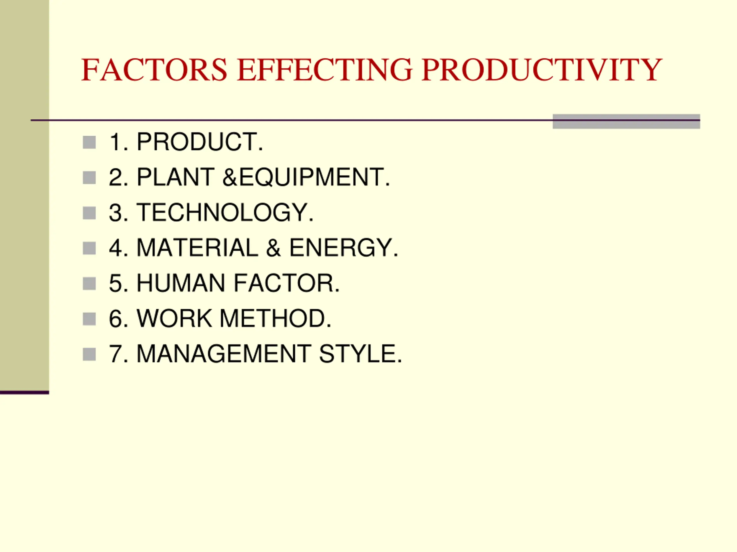 FACTORS EFFECTING PRODUCTIVITY 1. PRODUCT. 2. PLANT &EQUIPMENT. 3. TECHNOLOGY. 4. MATERIAL & ENERGY. 5. HUMAN FACTOR. 6. WORK METHOD. 7. MANAGEMENT STYLE.