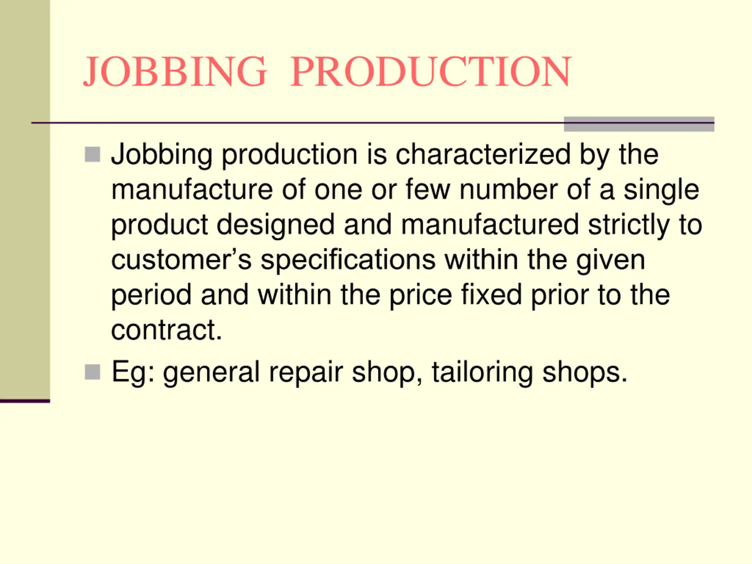 JOBBING PRODUCTION Jobbing production is characterized by the manufacture of one or few number of a single product designed and manufactured strictly to customer s specifications within the given period and within the price fixed prior to the contract. Eg: general repair shop, tailoring shops.