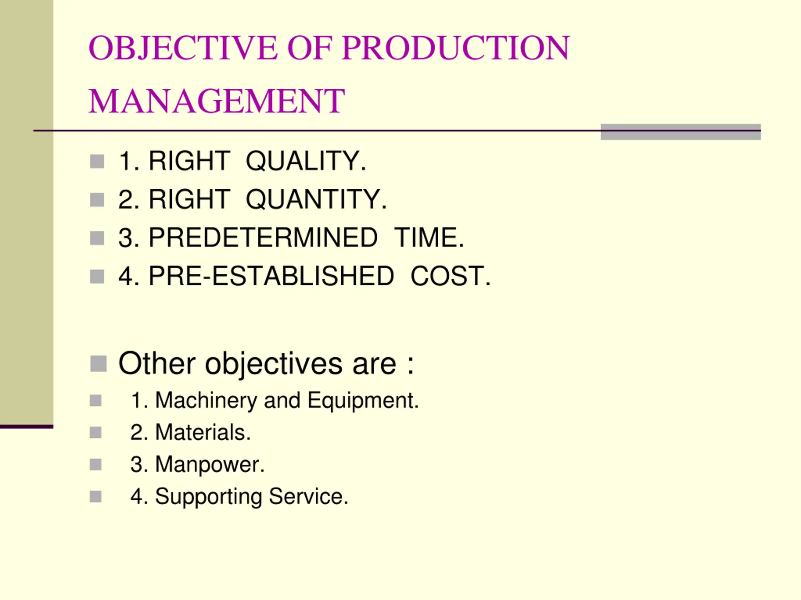 OBJECTIVE OF PRODUCTION MANAGEMENT 1. RIGHT QUALITY. 2. RIGHT QUANTITY. 3. PREDETERMINED TIME. 4. PRE-ESTABLISHED COST. Other objectives are : 1. Machinery and Equipment. 2. Materials. 3. Manpower. 4. Supporting Service.