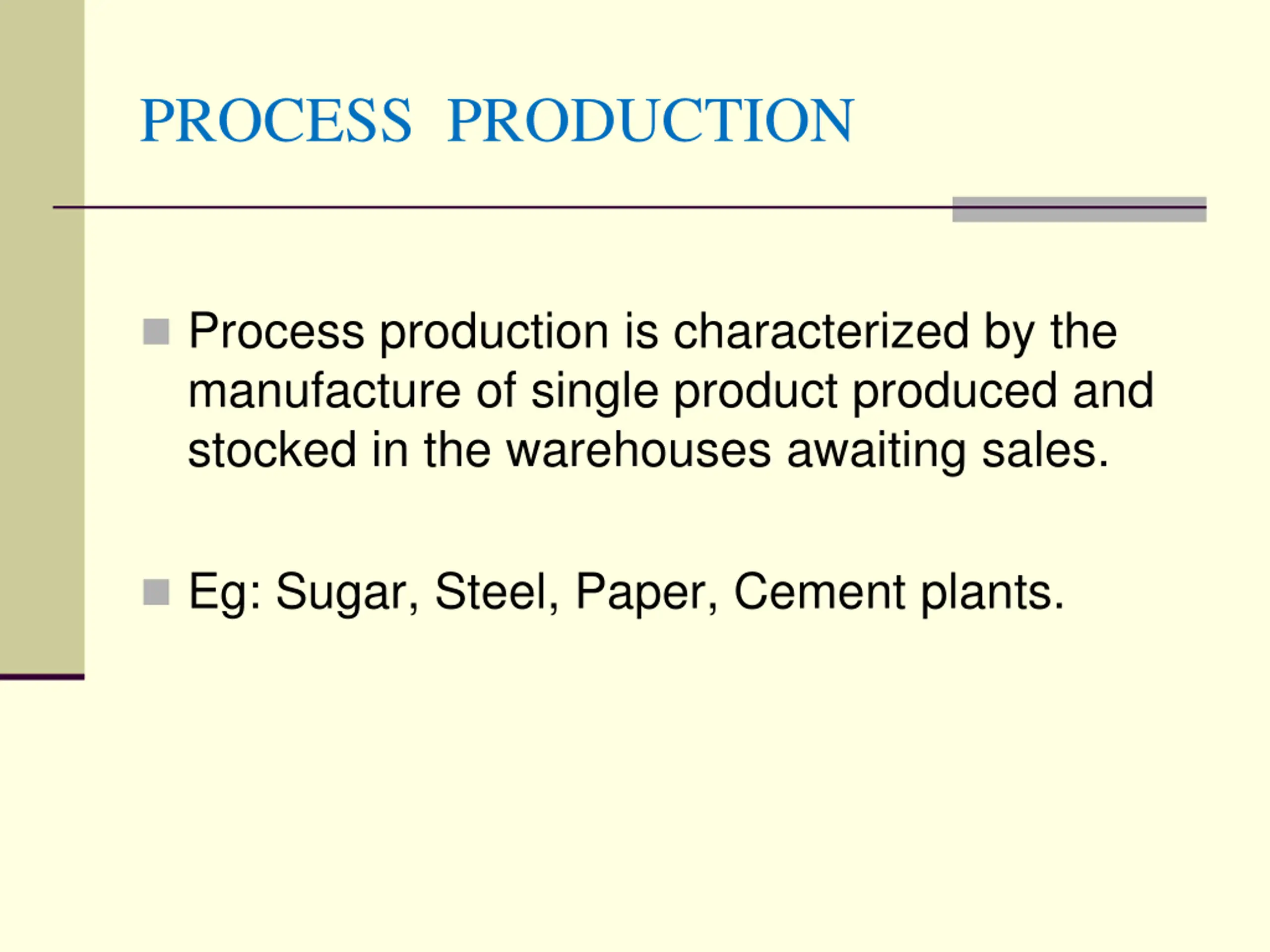 PROCESS PRODUCTION Process production is characterized by the manufacture of single product produced and stocked in the warehouses awaiting sales. Eg: Sugar, Steel, Paper, Cement plants.