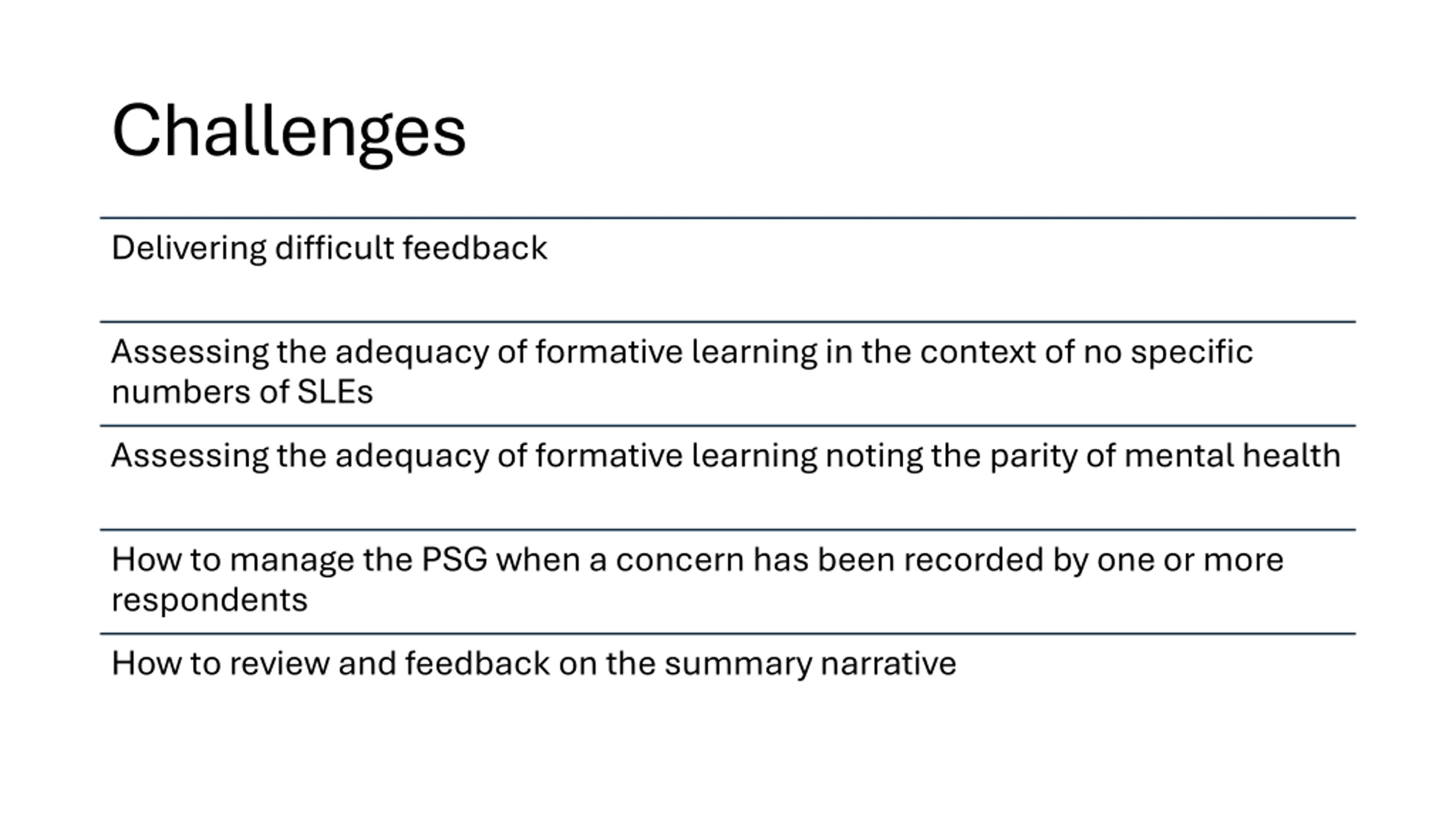 Challenges Delivering difficult feedback Assessing the adequacy of formative learning in the context of no specific numbers of SLEs Assessing the adequacy of formative learning noting the parity of mental health How to manage the PSG when a concern has been recorded by one or more respondents How to review and feedback on the summary narrative